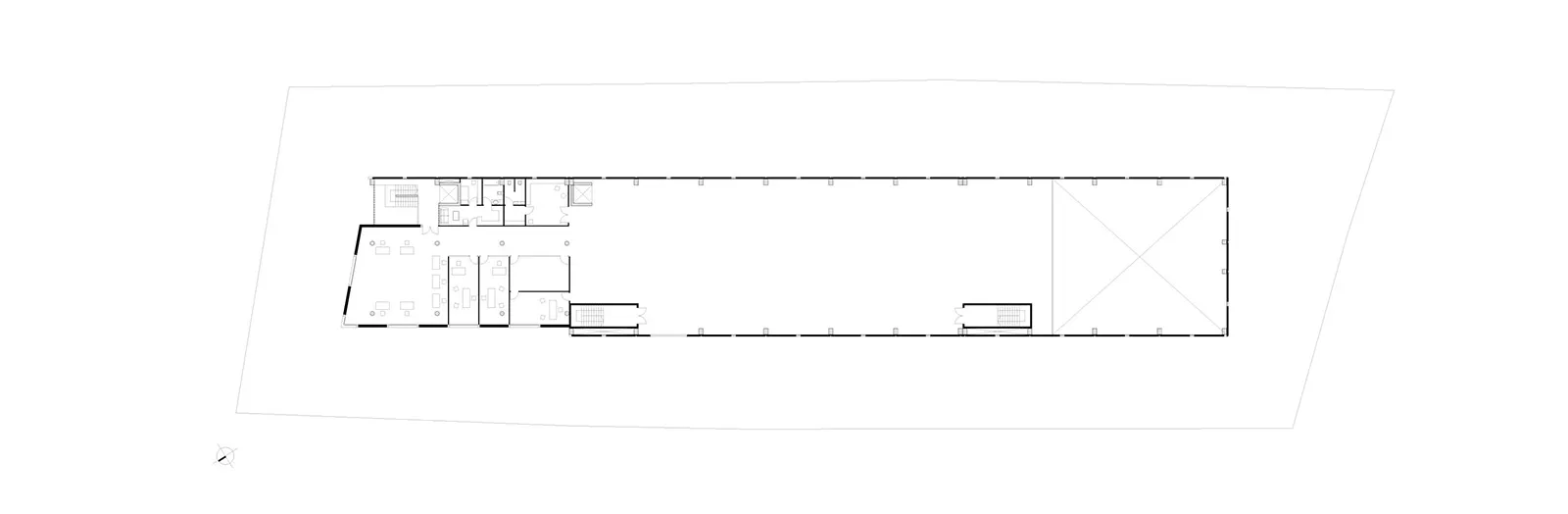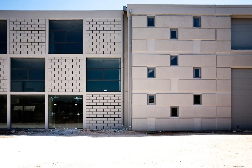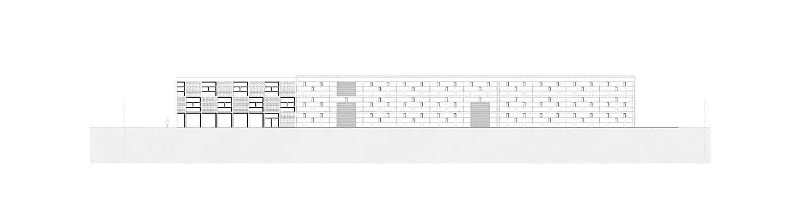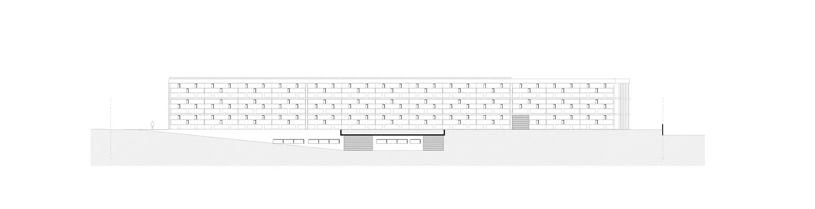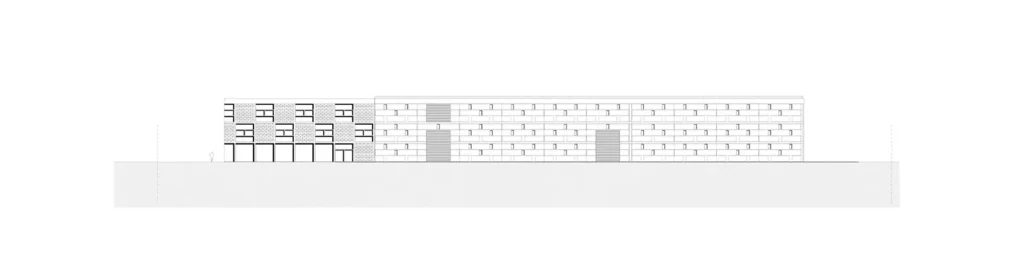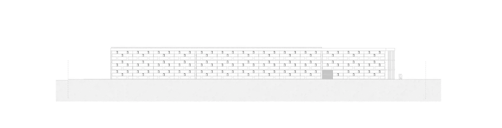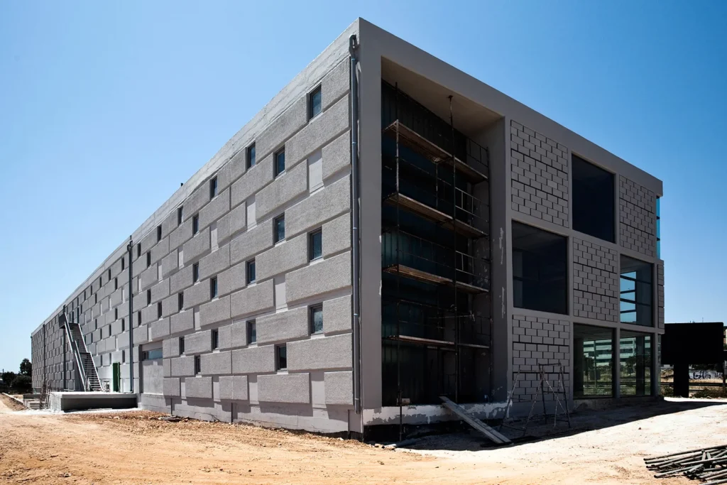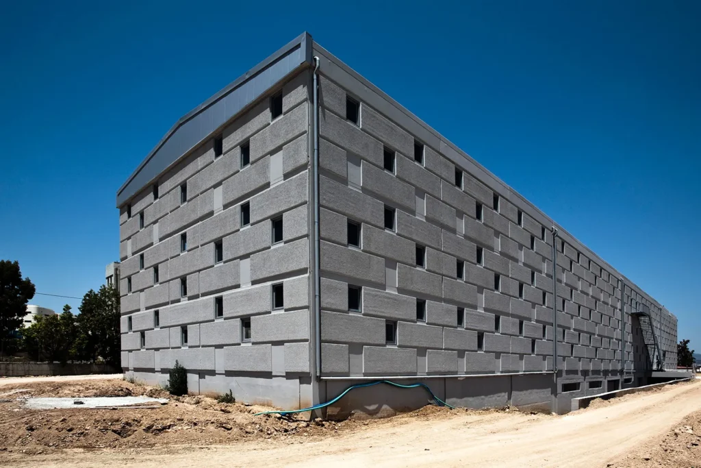 Το «θέμα» της μεγαλιθικής δομής, που δίνει στο κέλυφος του κτηρίου την μορφή ενός διάτρητου τείχους επαναλαμβάνεται με διαφορετικό τρόπο στο μέρος του κελύφους που στεγάζει τους γραφειακούς χώρους. Εκεί, το pattern του διάτρητου τείχους εκφράζεται με την τοποθέτηση εμφανών θερμομονωτικών «λίθων» στα πανέλα της όψης.