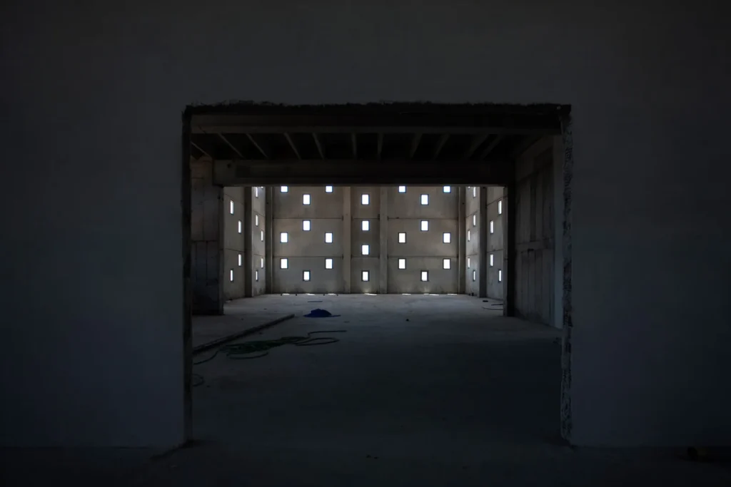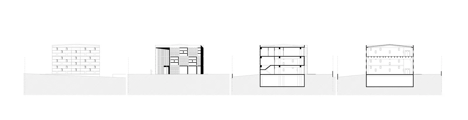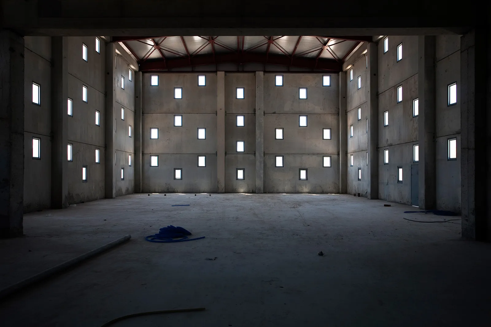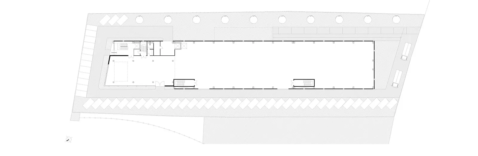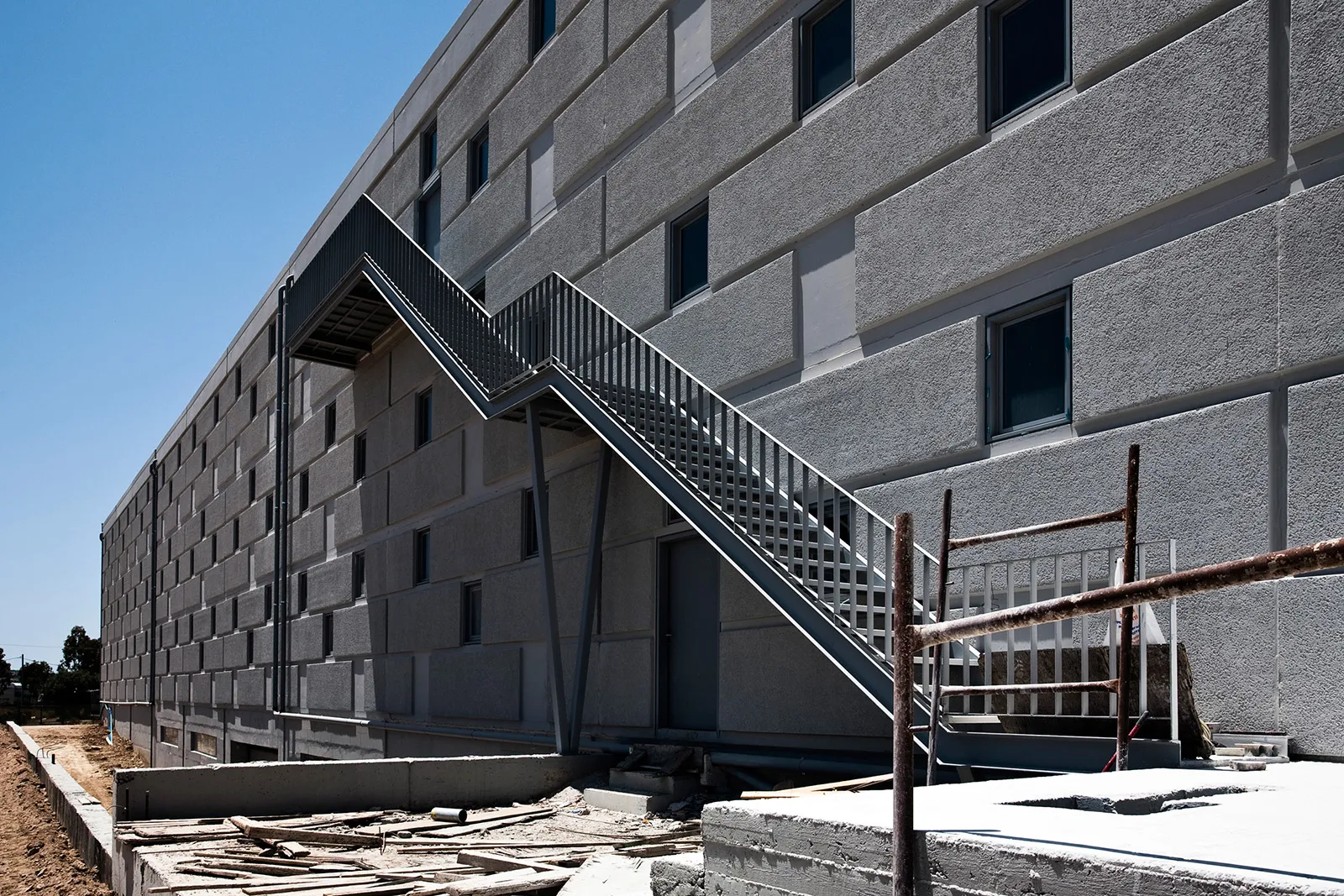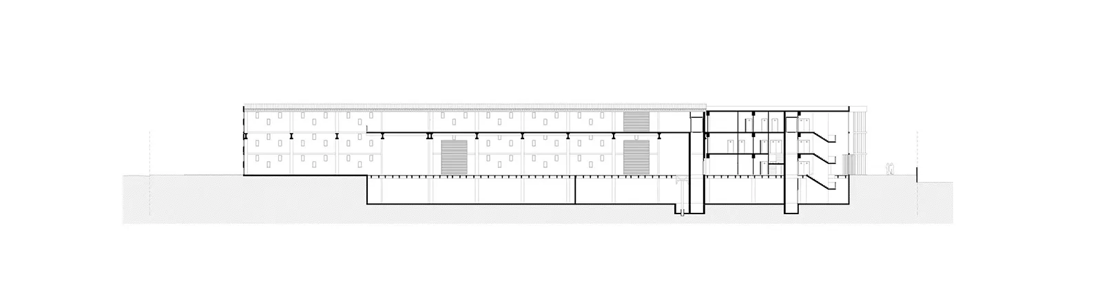 Το «θέμα» της μεγαλιθικής δομής, που δίνει στο κέλυφος του κτηρίου την μορφή ενός διάτρητου τείχους επαναλαμβάνεται με διαφορετικό τρόπο στο μέρος του κελύφους που στεγάζει τους γραφειακούς χώρους. Εκεί, το pattern του διάτρητου τείχους εκφράζεται με την τοποθέτηση εμφανών θερμομονωτικών «λίθων» στα πανέλα της όψης.