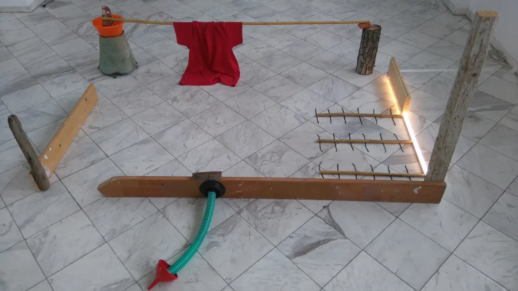 υλικά: ξύλα, καλάμια, ύφασμα, πλαστικό, ψάθα, φως led