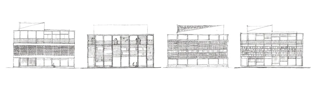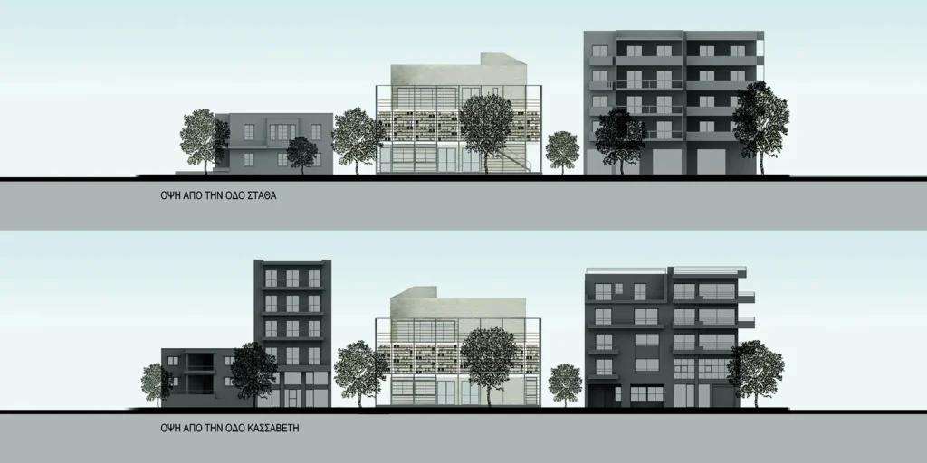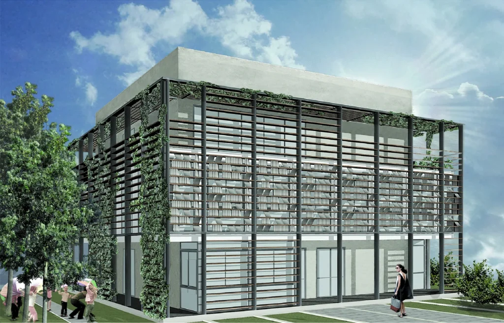 Τα σιδερένια πλαίσια που περιτυλίγουν τον οικοδομικό κύβο, έχουν ένα προφανή στόχο: Τον έλεγχο του ηλιακού φωτός, της σκιάς και του αέρα και τις εν γένει κλιματικής συνθήκης του έξω και του μέσα. Η πλαισίωση του οικοδομήματος επαναμορφοποιεί το όριο παράγοντας ενδιάμεσους χώρους φωτός και σκιάς, υπαίθριου και κλειστού χώρου. Αναρρηχητικά θα καλύψουν τις επιφάνειες που δημιουργεί ο σκελετός με ξύλινες περσίδες/ μαδέρια, που ανεβαίνουν στο κτήριο σαν σκαλωσιά.