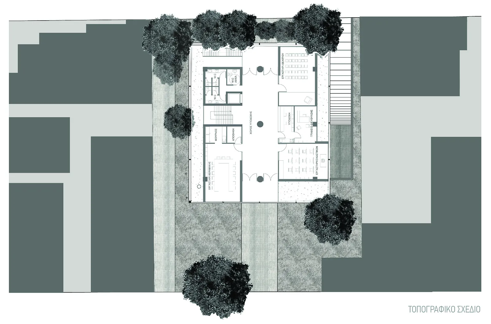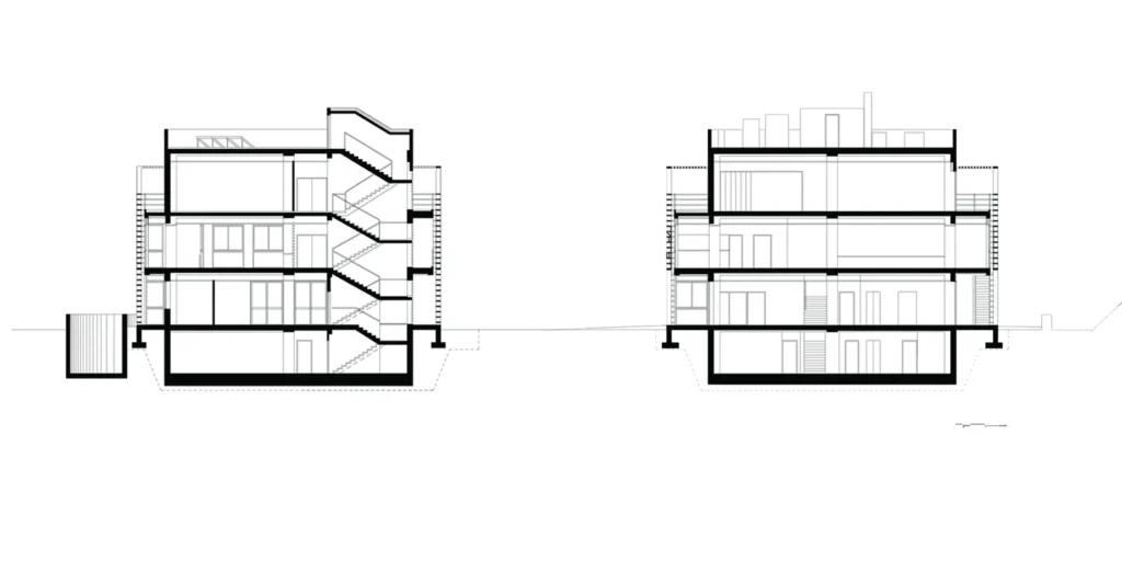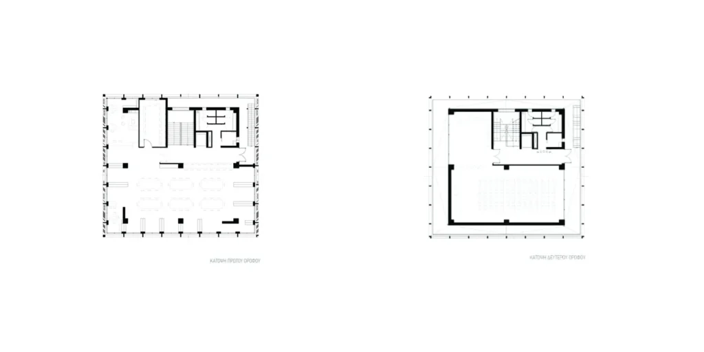 Ένα μπετονένιο, κυβικό οικοδόμημα τοποθετείται έκκεντρα στο οικόπεδο, για να αφήνει ελεύθερο υπαίθριο χώρο για την υπαίθρια δραστηριότητα του κέντρου, ανοιχτή σαν πλατεία προς την πόλη. Ο κτηριακός τύπος ευνοεί την επανάληψη μιας ανοικτής κάτοψης τρείς φορές καθ ύψος. Εγκυβωτίζεται εξωτερικά σε σε σιδερένια πλαίσια στις τέσσερεις πλευρές, έξω από τον κλειστό κύβο.