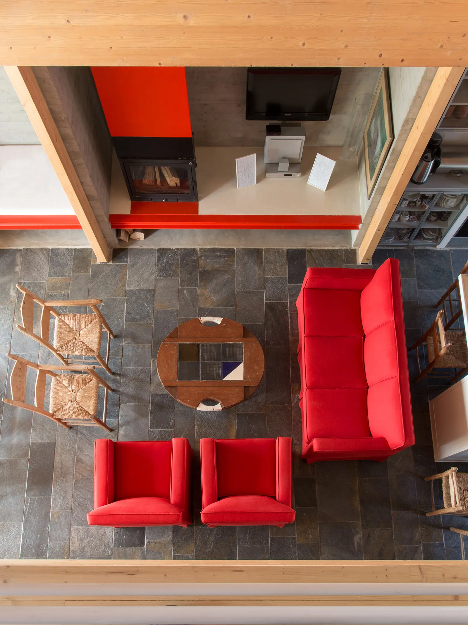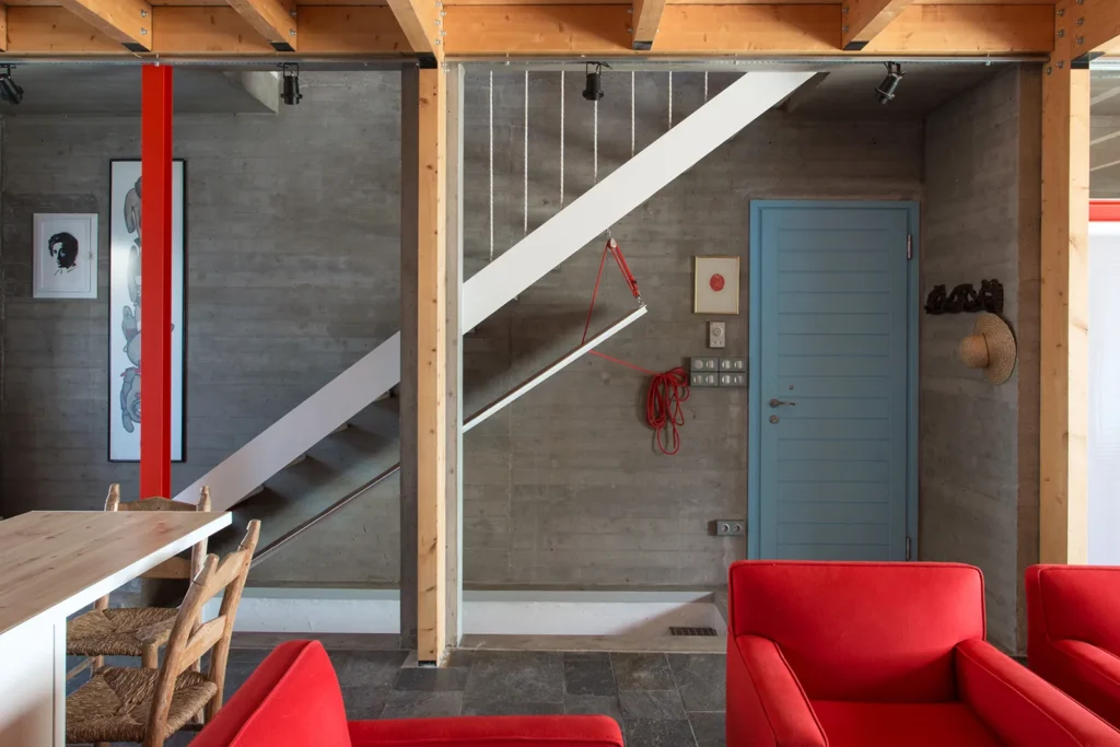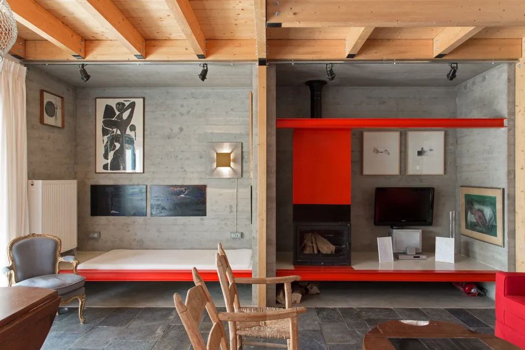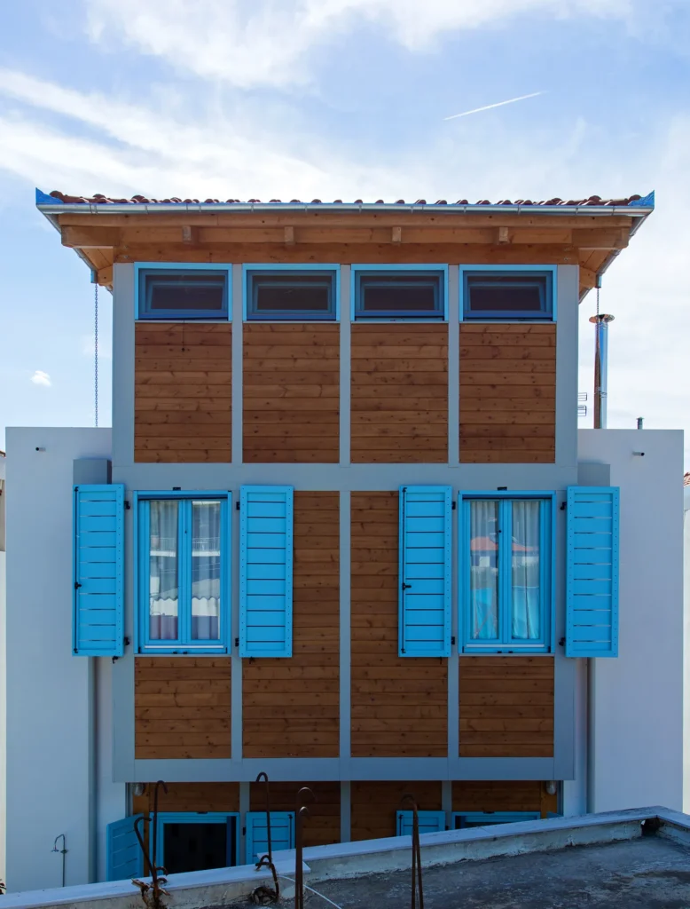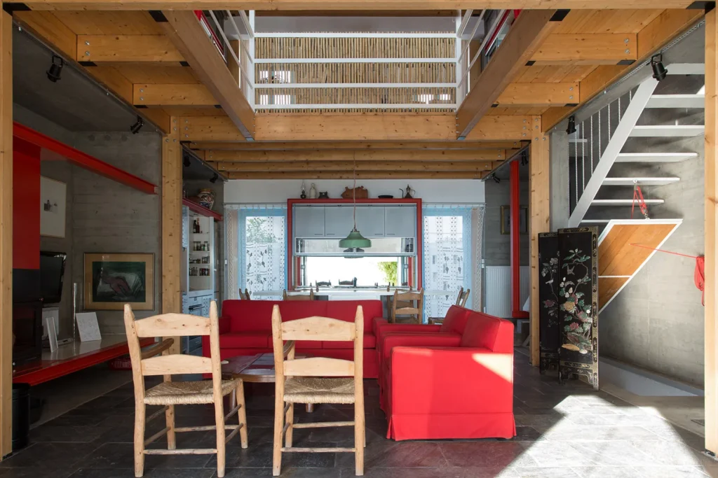 Με όρους τυπολογίας, η κατοικία θα μπορούσε να θεωρηθεί ότι οργανώνεται στον τύπο της τρίκλιτης βασιλικής με εσωτερικό αίθριο. Στο μεσαίο κλίτος, πλάτους 4,30μ. που ορίζεται από τέσσερα ζεύγη ξύλινων κιόνων, με διαστύλωση 2,60μ., αναπτύσσεται η καθημερινή επιτελεστικότητα της διαμονής. Στα δύο πλευρικά κλίτη, από οπλισμένο σκυρόδεμα, βάθους 1μ., οργανώνεται η βοηθητική επιτελεστικότητα (κατακόρυφη μετακίνηση, αποθήκευση, υγιεινή, μαγείρεμα). Η κατασκευή του κτηρίου υλοποιεί την τυπολογία. Τα πλευρικά κλίτη από μπετόν, συγκρατούν το μεσαίο κλίτος, που είναι αμιγώς ξύλινη προκατασκευή.