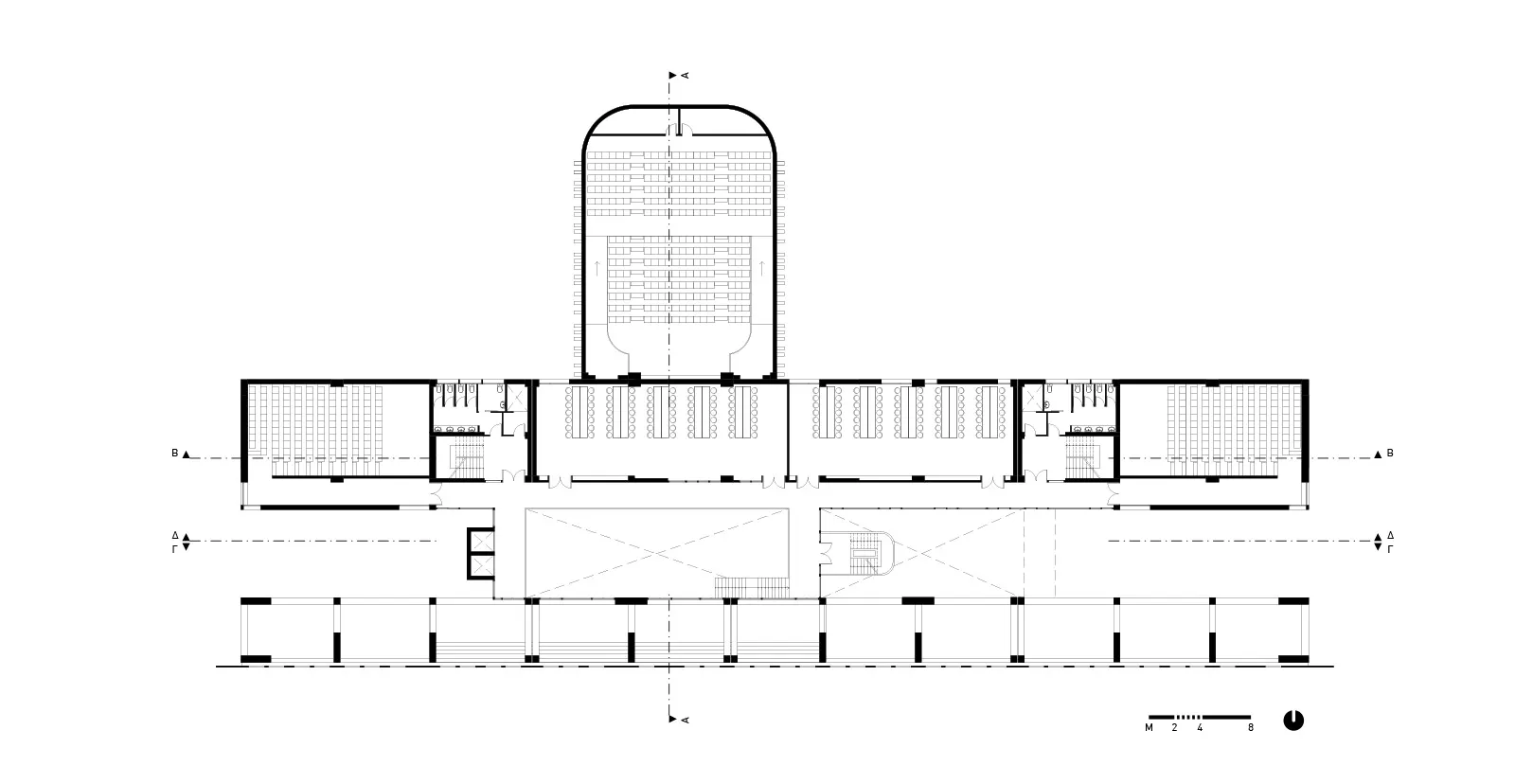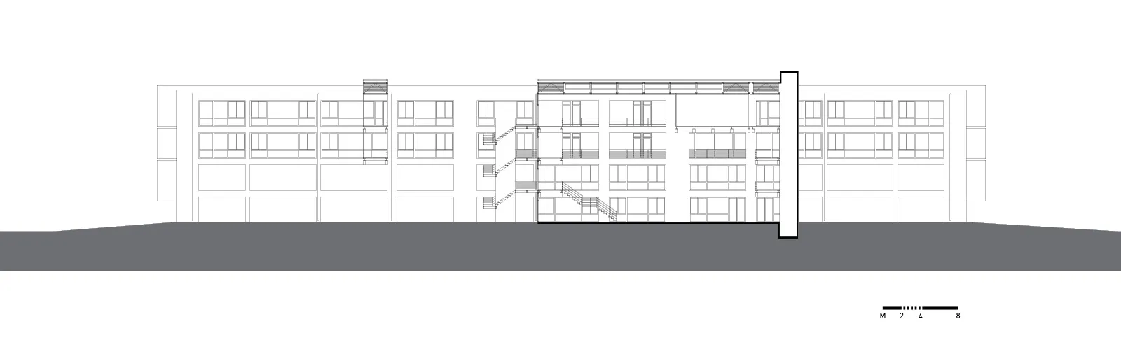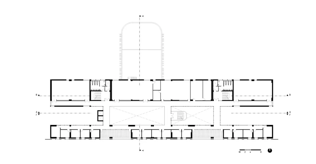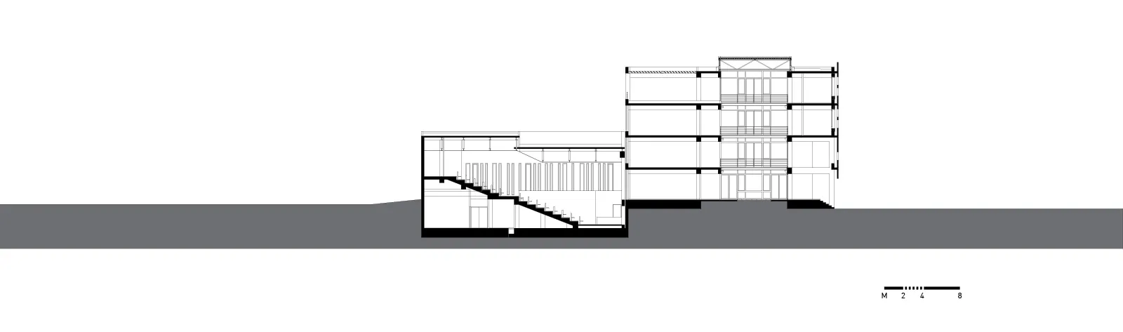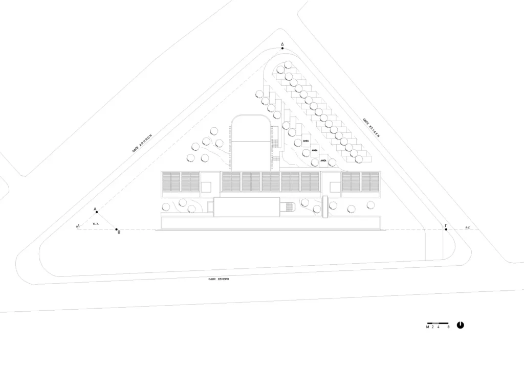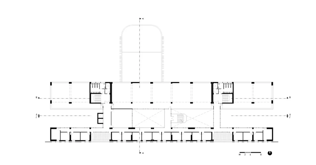 Στην εγκάρσια τομή του κτηρίου αναδεικνύονται η βιοκλιματική του λειτουργία, ο φυσικός φωτισμός, ο ηλιασμός, η φυσική θέρμανση και ο δροσισμός με τον τρόπο που επιτυγχάνεται με τις ροές του φυσικού αέρα, οριζόντια και κατακόρυφα. Στο ισόγειο του κτηρίου τοποθετούνται οι χρήσεις ευρέως κοινού (τρία αμφιθέατρα, γραμματεία, φουαγιέ). Οι κοινόχρηστοι χώροι, pitolis, στον νοτιά και φουαγιέ με φύτευση, οργανώνουν την κοινή ζωή του κτηρίου.