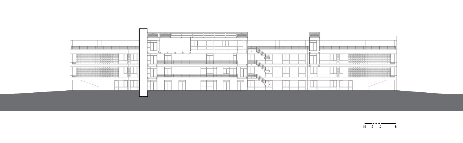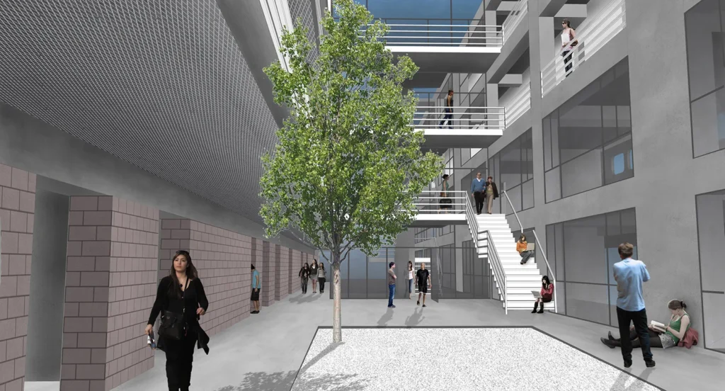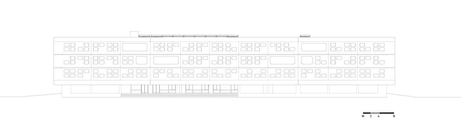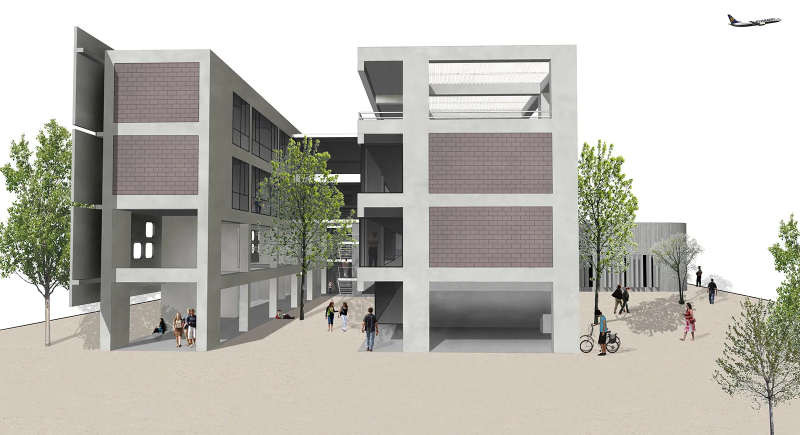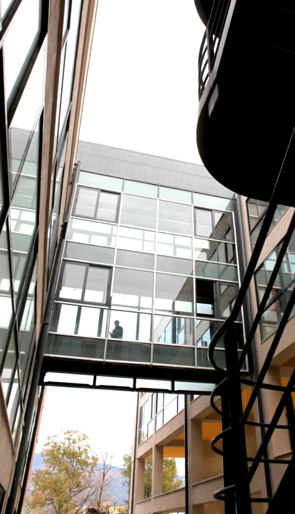 Στην εγκάρσια τομή του κτηρίου αναδεικνύονται η βιοκλιματική του λειτουργία, ο φυσικός φωτισμός, ο ηλιασμός, η φυσική θέρμανση και ο δροσισμός με τον τρόπο που επιτυγχάνεται με τις ροές του φυσικού αέρα, οριζόντια και κατακόρυφα. Στο ισόγειο του κτηρίου τοποθετούνται οι χρήσεις ευρέως κοινού (τρία αμφιθέατρα, γραμματεία, φουαγιέ). Οι κοινόχρηστοι χώροι, pitolis, στον νοτιά και φουαγιέ με φύτευση, οργανώνουν την κοινή ζωή του κτηρίου.