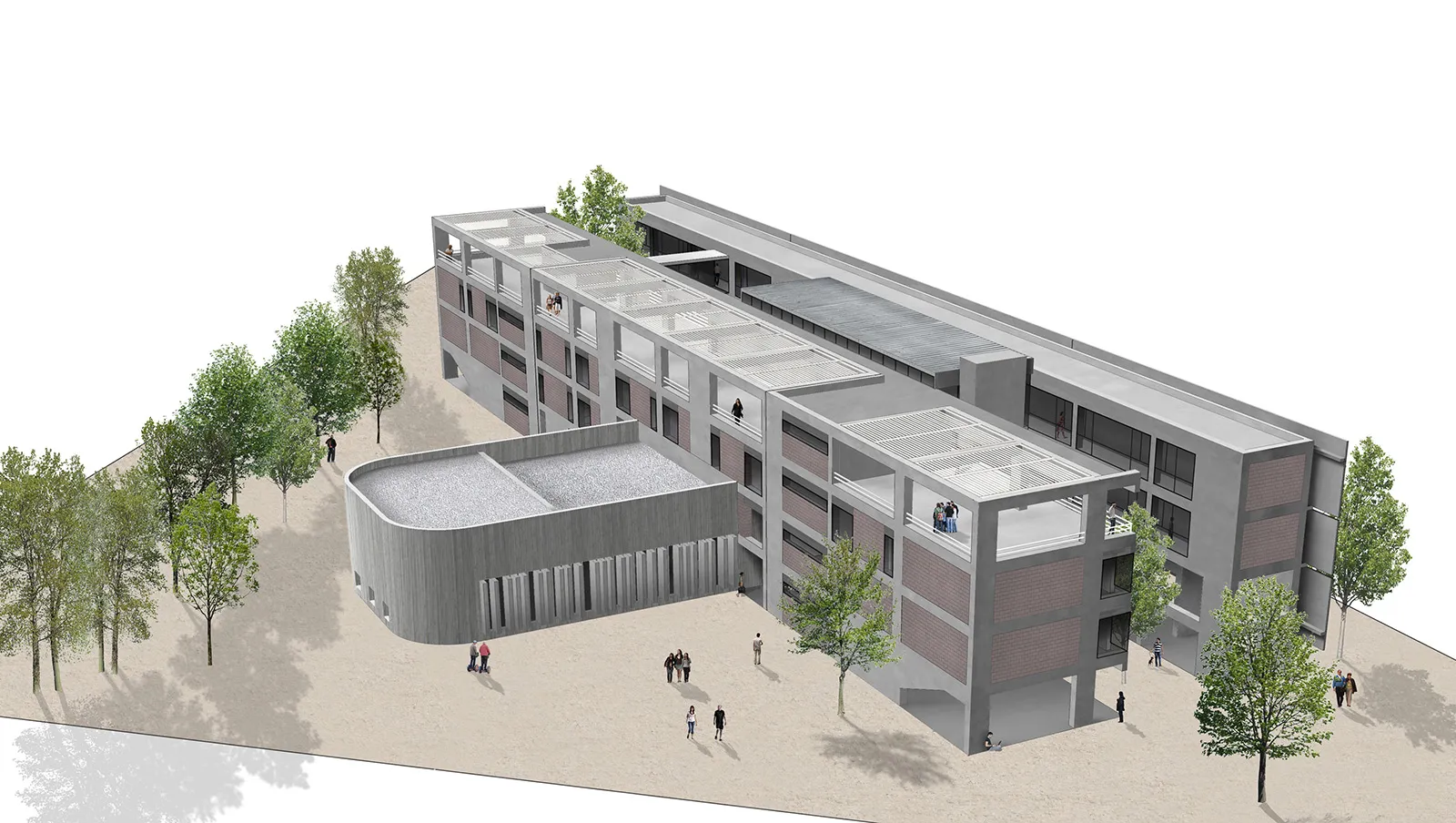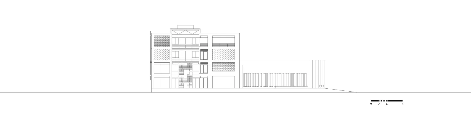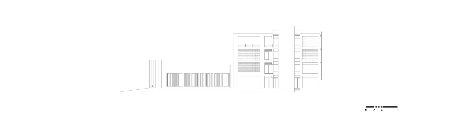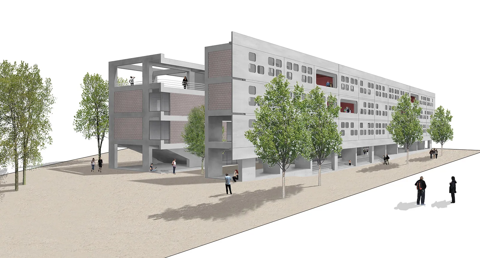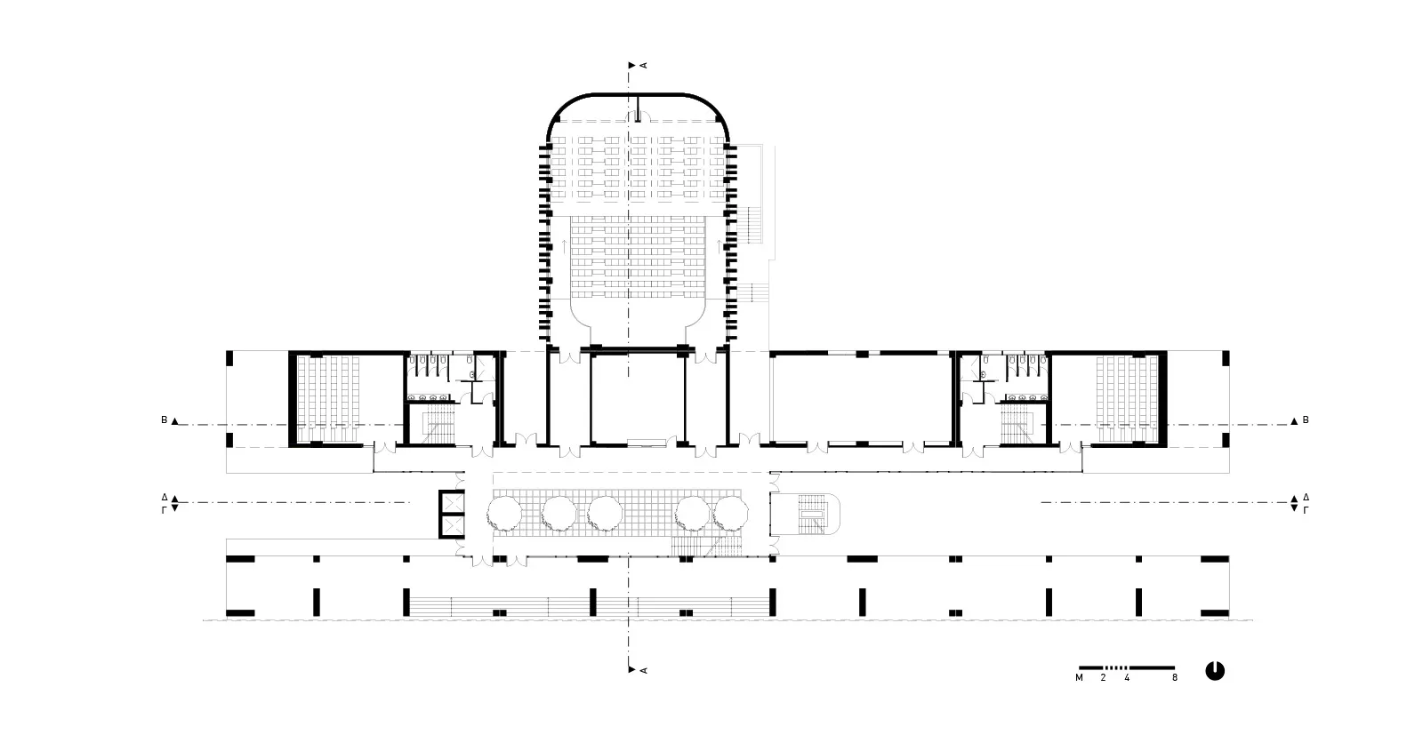 Στην εγκάρσια τομή του κτηρίου αναδεικνύονται η βιοκλιματική του λειτουργία, ο φυσικός φωτισμός, ο ηλιασμός, η φυσική θέρμανση και ο δροσισμός με τον τρόπο που επιτυγχάνεται με τις ροές του φυσικού αέρα, οριζόντια και κατακόρυφα. Στο ισόγειο του κτηρίου τοποθετούνται οι χρήσεις ευρέως κοινού (τρία αμφιθέατρα, γραμματεία, φουαγιέ). Οι κοινόχρηστοι χώροι, pitolis, στον νοτιά και φουαγιέ με φύτευση, οργανώνουν την κοινή ζωή του κτηρίου.