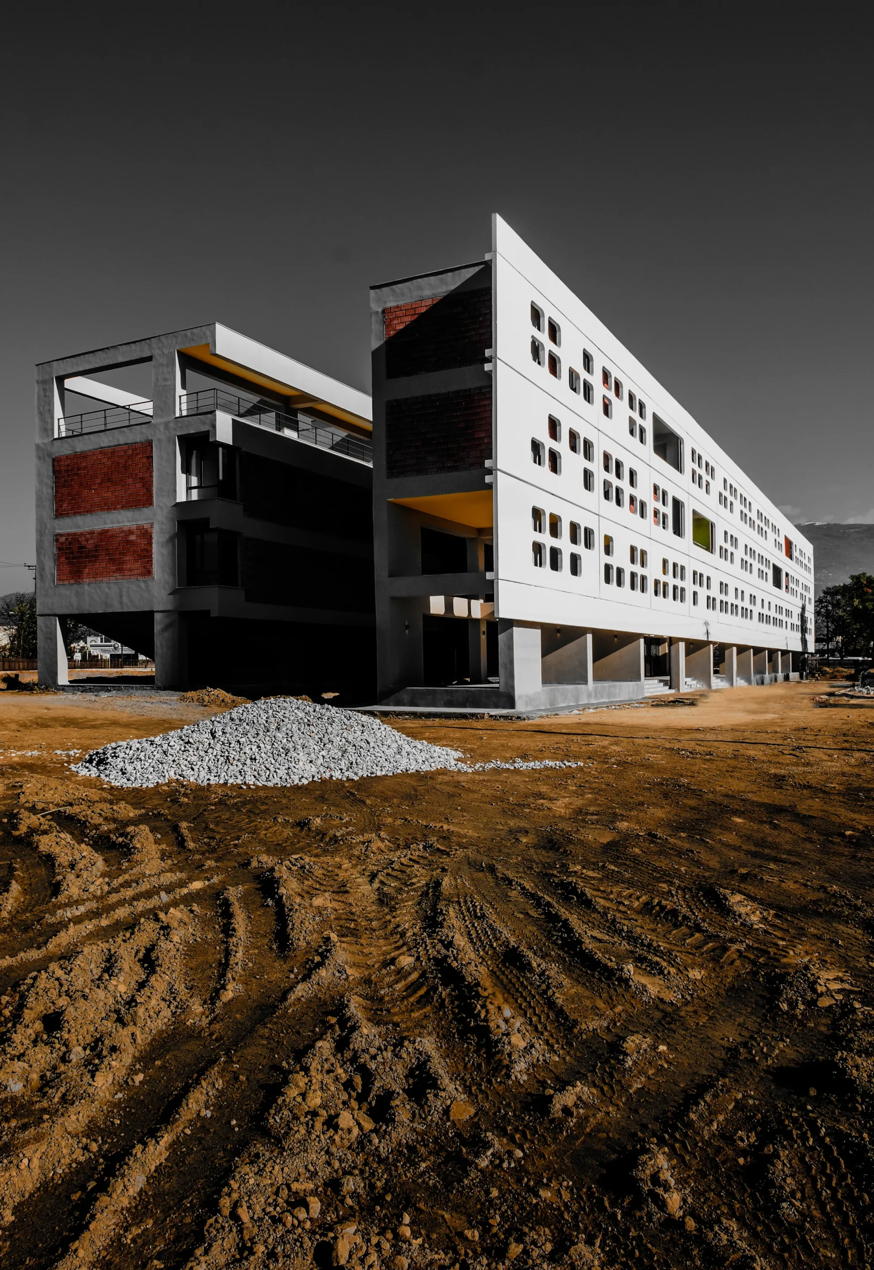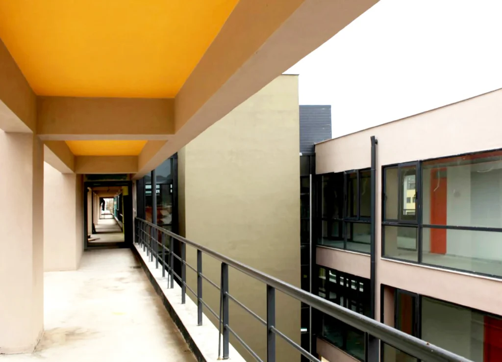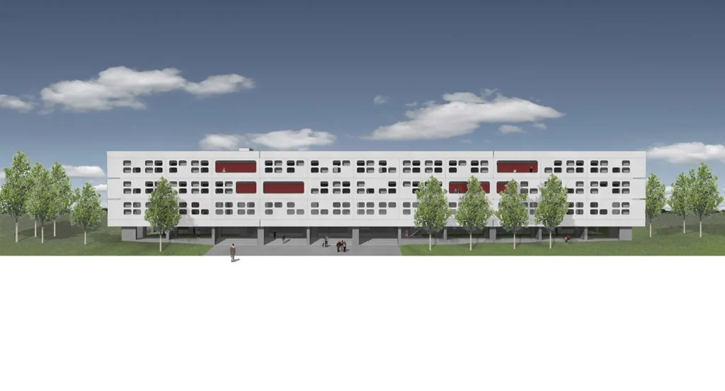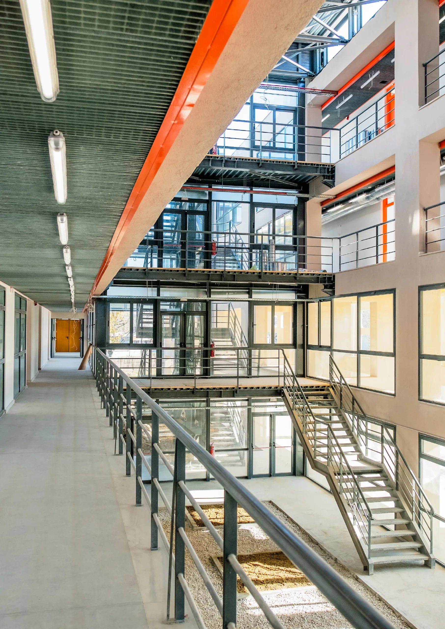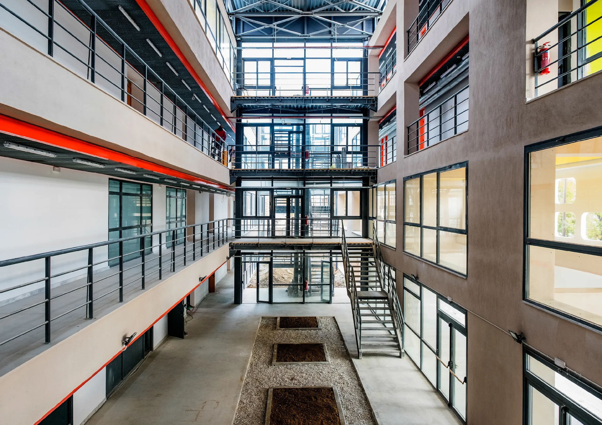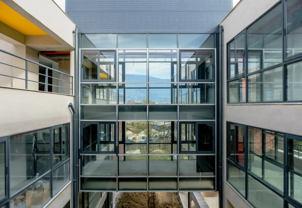 Η κατασκευή είναι συμβατική από οπλισμένο σκυρόδεμα και στοιχεία πληρώσεως, ενώ το κεντρικό τμήμα είναι μεταλλική κατασκευή. Προκατασκευασμένα πανέλα από μπετόν ντύνουν τη μεσημβρινή όψη για ηλιοπροστασία της επιφάνειας της όψης.