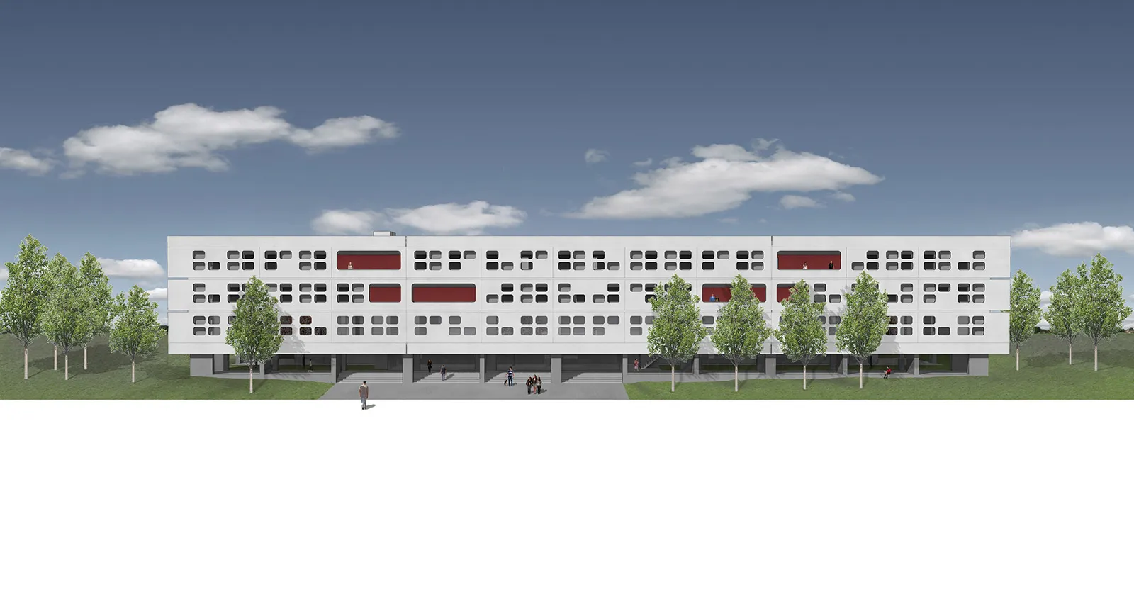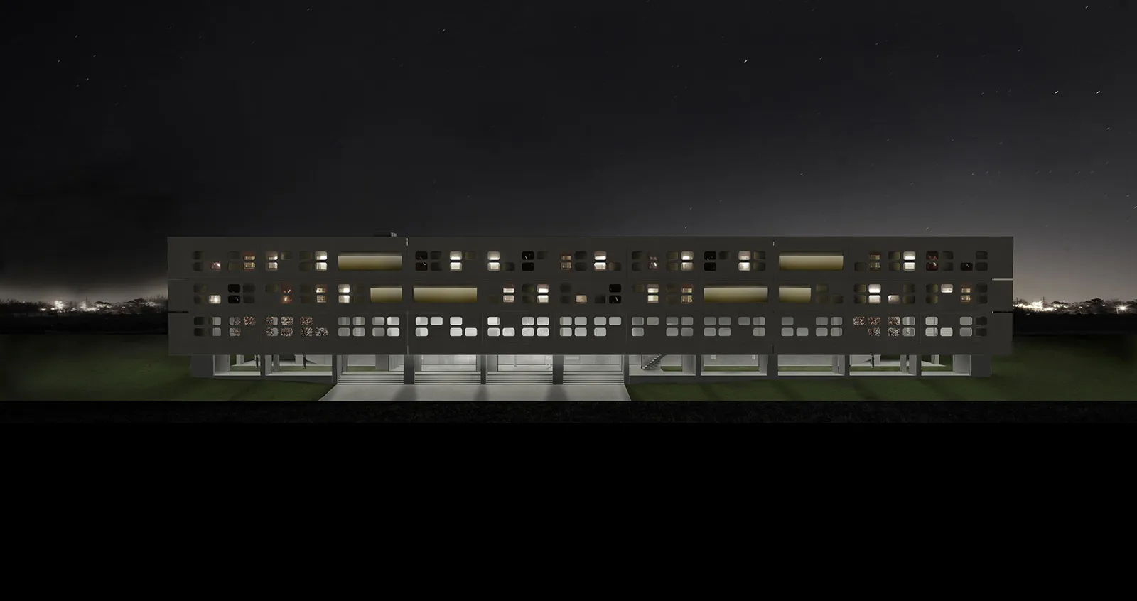 Η νότια όψη του κτηρίου, είναι το μέτωπο θέασης του κτηρίου από την πόλη. Η όψη μορφοποιείται με τη λογική ψηφίων κενού στο πλήρες της όψης. Η συμβολική αυτή αναφορά στον ψηφιακό κόσμο ανταποκρίνεται στη συνολικότερη εννόηση του προγράμματος του κτηρίου. Το κέλυφος/κτήριο είναι ένα “hardware”, το περιεχόμενο του οποίου είναι το ίδιο το “software” της πανεπιστημιακής ζωής.
