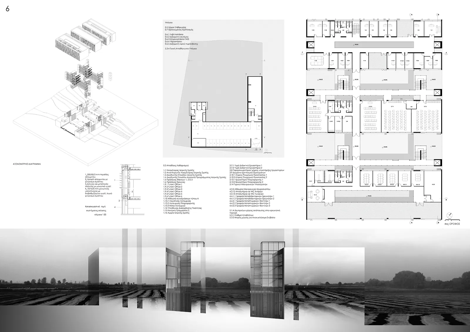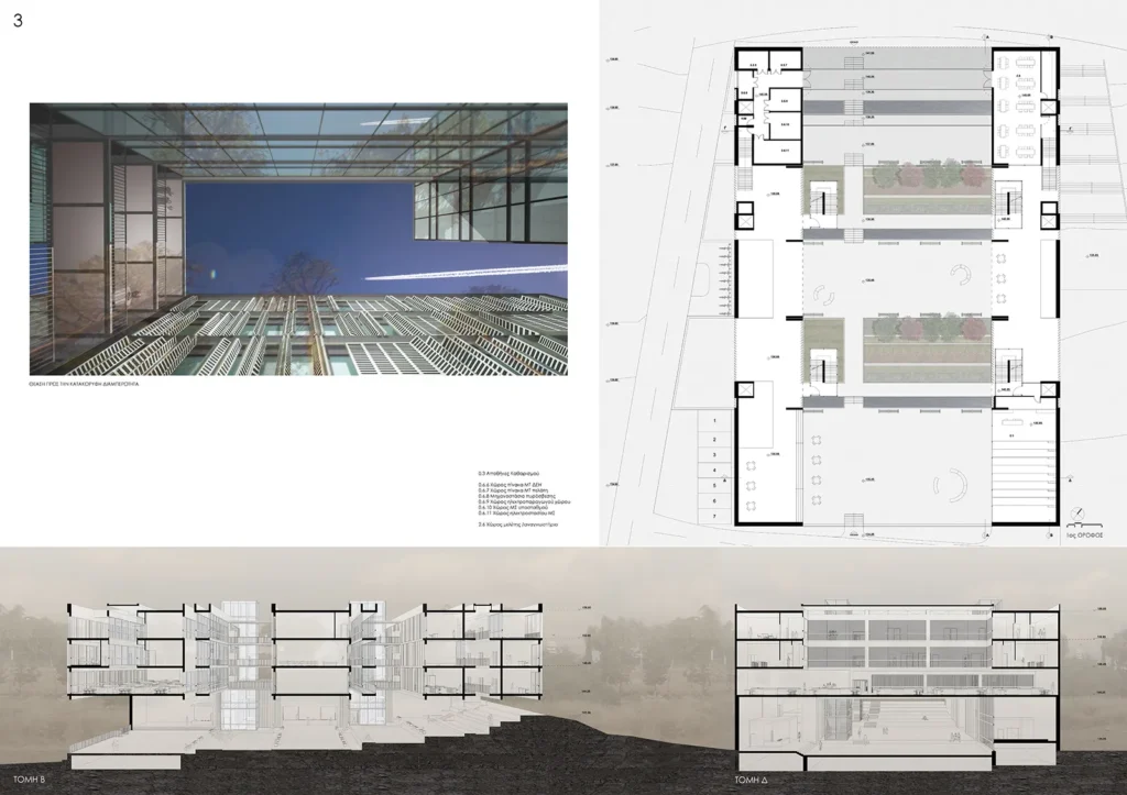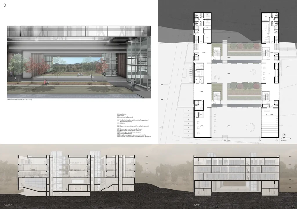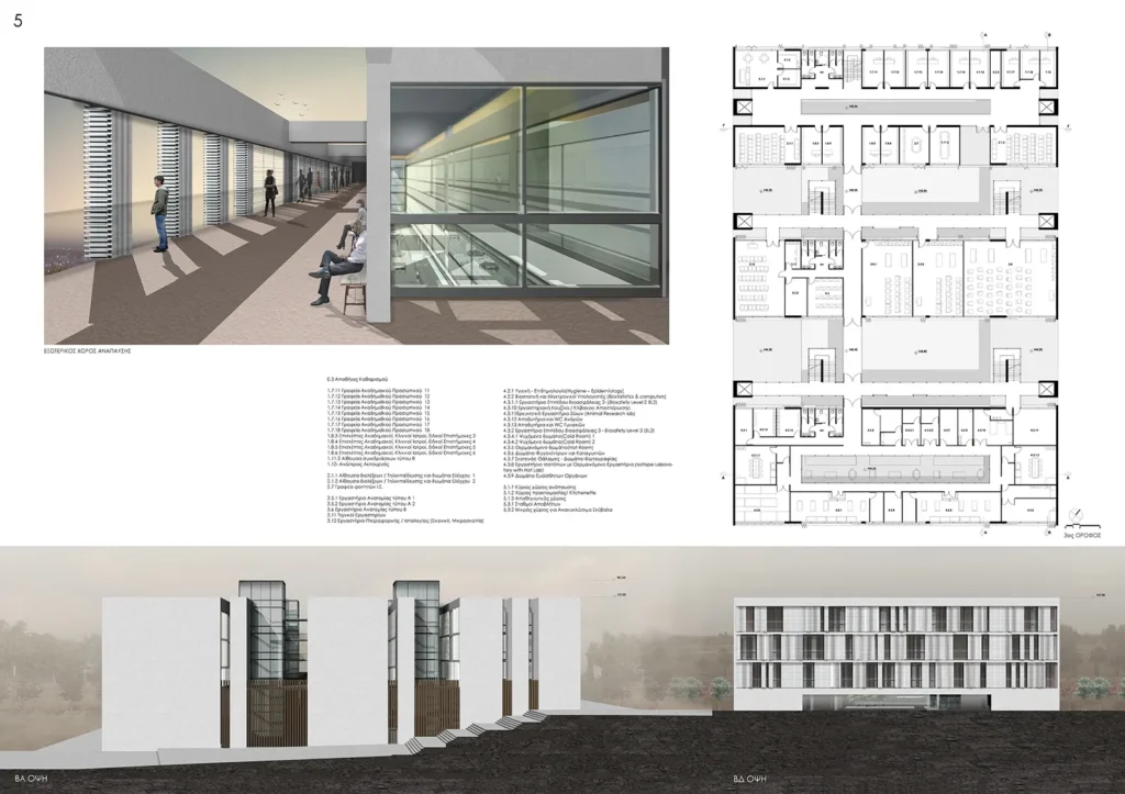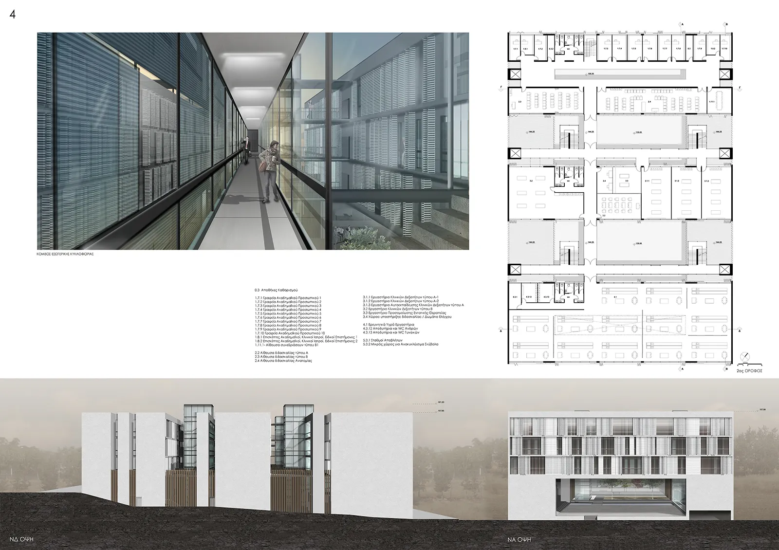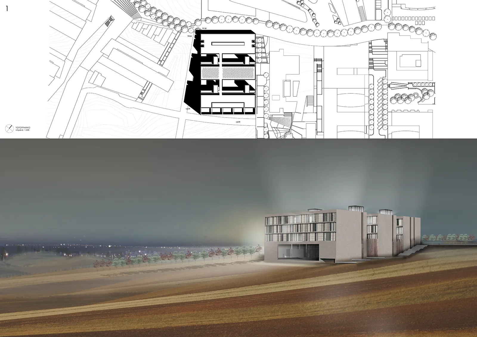 Το campus του Πανεπιστημίου της Κύπρου έχει προκύψει από το τεμαχισμό του εδάφους σε χωριστά οικόπεδα, που παραλαμβάνουν ξεχωριστά κτήρια-προγράμματα. Η πρόταση επιχειρεί να αναστρέψει, έστω και μεμονωμένα, τη λογική διαχωρισμού των κτηρίων-οικοπέδων. Εισάγεται μια δημόσια κίνηση δια μέσου του νέου κτηρίου της Ιατρικής, διαμπερής από το βοριά στο νοτιά. Με τον τρόπο αυτό ο βασικός πεζόδρομος Belvedere του Πανεπιστημίου αποκτά μια κάθετη αστική σπονδύλωση προεκτείνοντας το δημόσιο χώρο εντός του κτηρίου σε συνθήκη ελεγχόμενη και οργανωμένη, με οπτικές φυγές προς τον ανοιχτό ορίζοντα. Καταστατική σχεδιαστική χειρονομία είναι η τοποθέτηση δύο διαμήκων πρισμάτων στη βάση, και επάνω σε αυτά, η εναπόθεση εγκάρσιων πρισμάτων, σε απόσταση μεταξύ τους, για την αποκατάσταση μιας πορώδους, ευάερης και ευήλιας τυπολογίας, στο pattern της «σχάρας». Σε αντίθεση με σύγχρονα κτήρια που αναπαράγουν την κλειστή δομή, εδώ προτείνεται η ανοικτή, γραμμική δομή κτηρίου. Η πρόταση εισάγει μια ανοιχτή δομή κτηρίου σε αναλογία με τον αναγεννησιακό τύπο της Λότζιας (Loggia). Η λότζια είναι στεγασμένος αστικός, δημόσιος, χώρος σε κρίσιμους κυκλοφοριακούς κόμβους του αστικού ιστού. Η ιατρική σχολή εκφράζοντας την κομβική σχέση της επιστήμης που υπηρετεί με την κοινωνία αναπαράγει στην παρούσα πρόταση τον αστικό τύπο του κτηρίου-λότζιας.