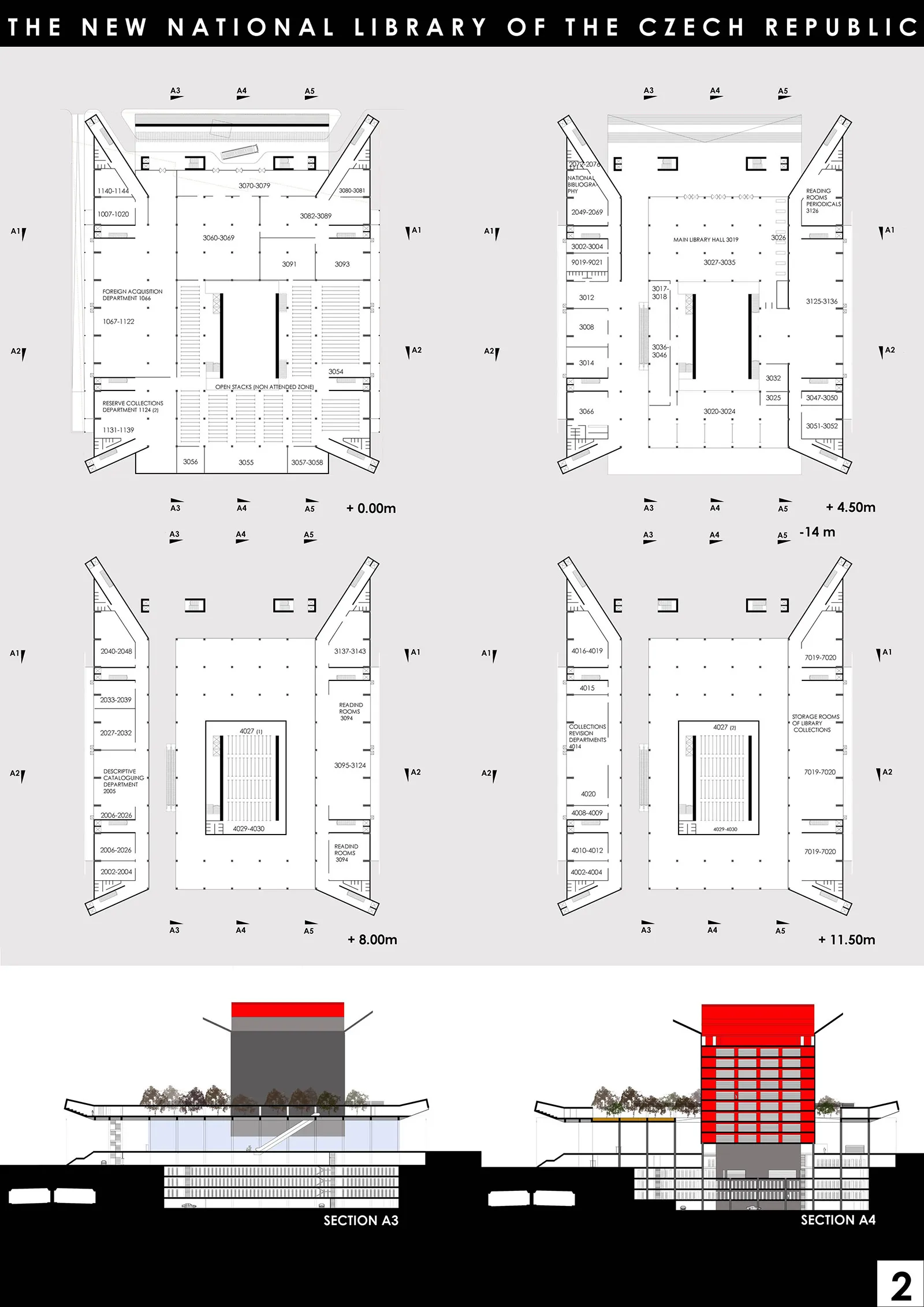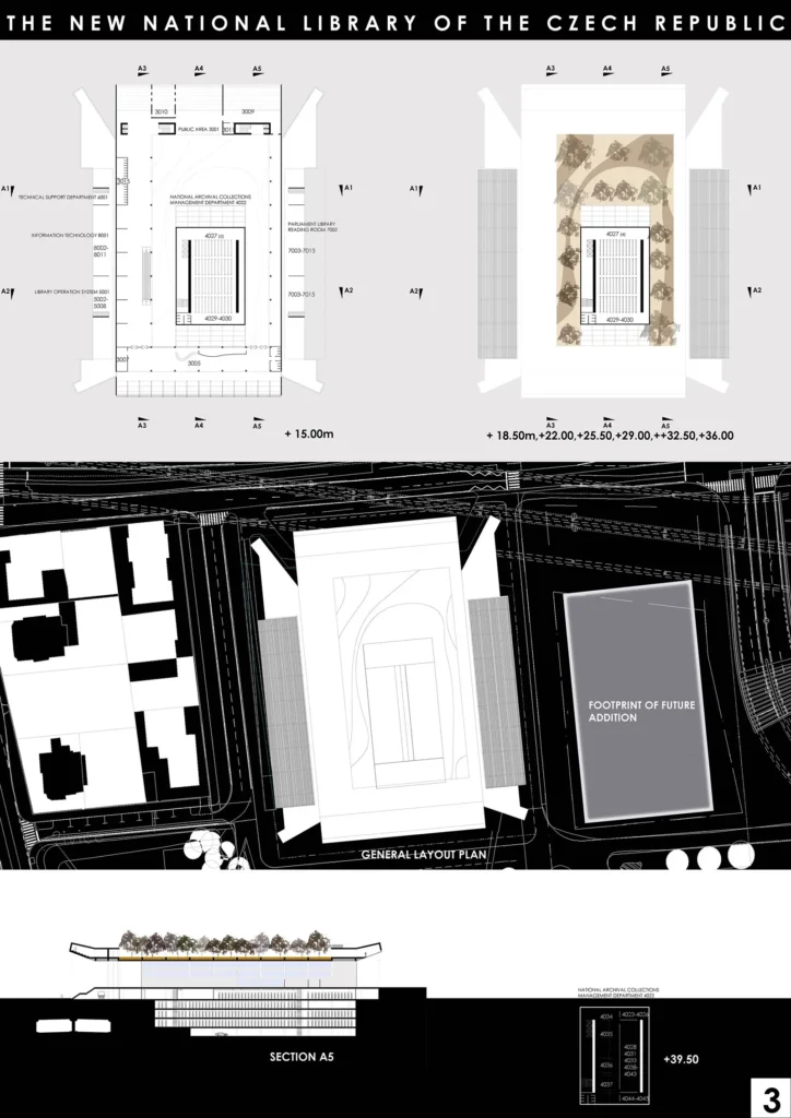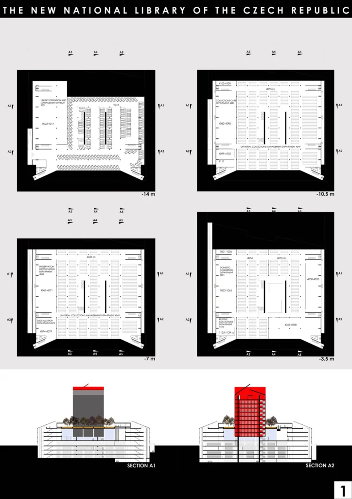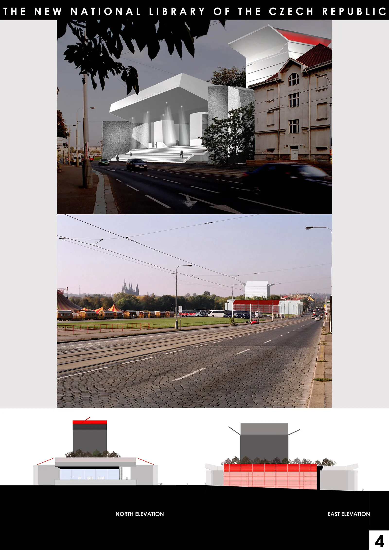 Στα όρια της παλιάς με τη νέα πόλη της Πράγας θα ανεγερθεί το νέο κτήριο της Εθνικής Βιβλιοθήκης της Τσεχίας συνολικής επιφάνειας 40.000 τ.μ. Η πρόταση προβλέπει ένα κτήριο ανοικτό-διαμπερές από την πόλη προς το ποτάμι, όπου τα βιβλιοστάσια είναι στα υπόγεια και τα αναγνωστήρια και οι υπηρεσίες υποστήριξης στους ορόφους, σε δύο πυέρυγες γύρω από την κύρια αίθουσα της βιβλιοθήκης. Το γενικό αρχείο του κράτους φιλοξενείται σε κατακόρυφο πύργο εγκάθετο στην «καρδιά» του κτηρίου. Η μάζα του κτηρίου αναλύεται σε τρείς δομικούς όγκους –τον ένα μέσα στον άλλο– που λειτουργούν μεταφορικά ως ανοικτά κουτιά συσκευσίας των βιβλίων, ανοικτά προς την πόλη και προς τον ουρανό της Πράγας.