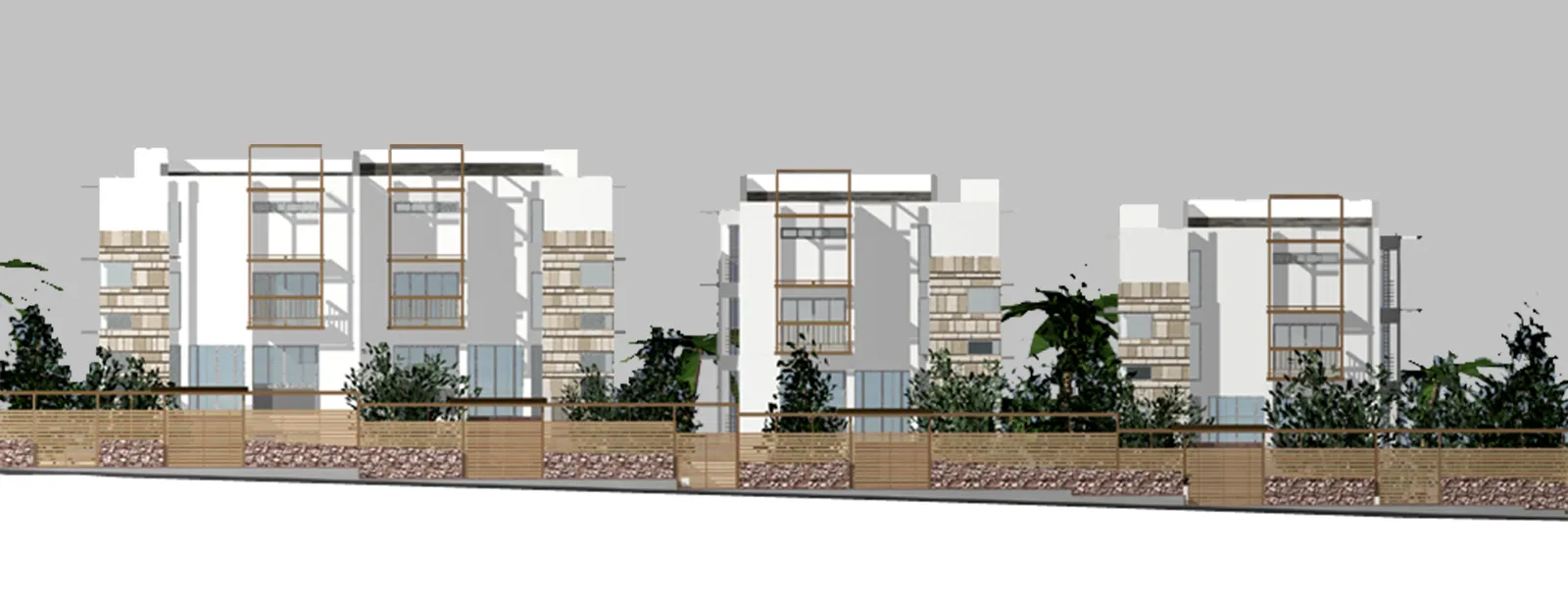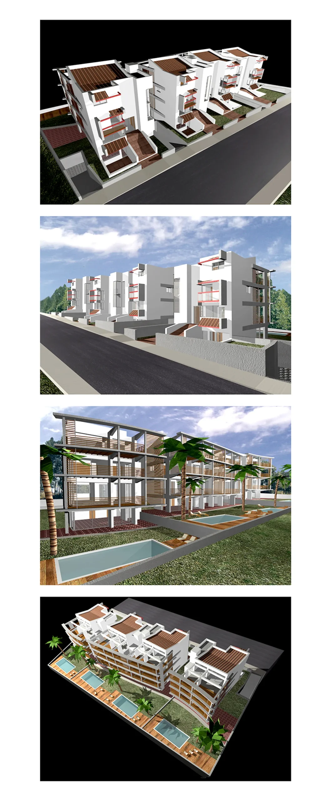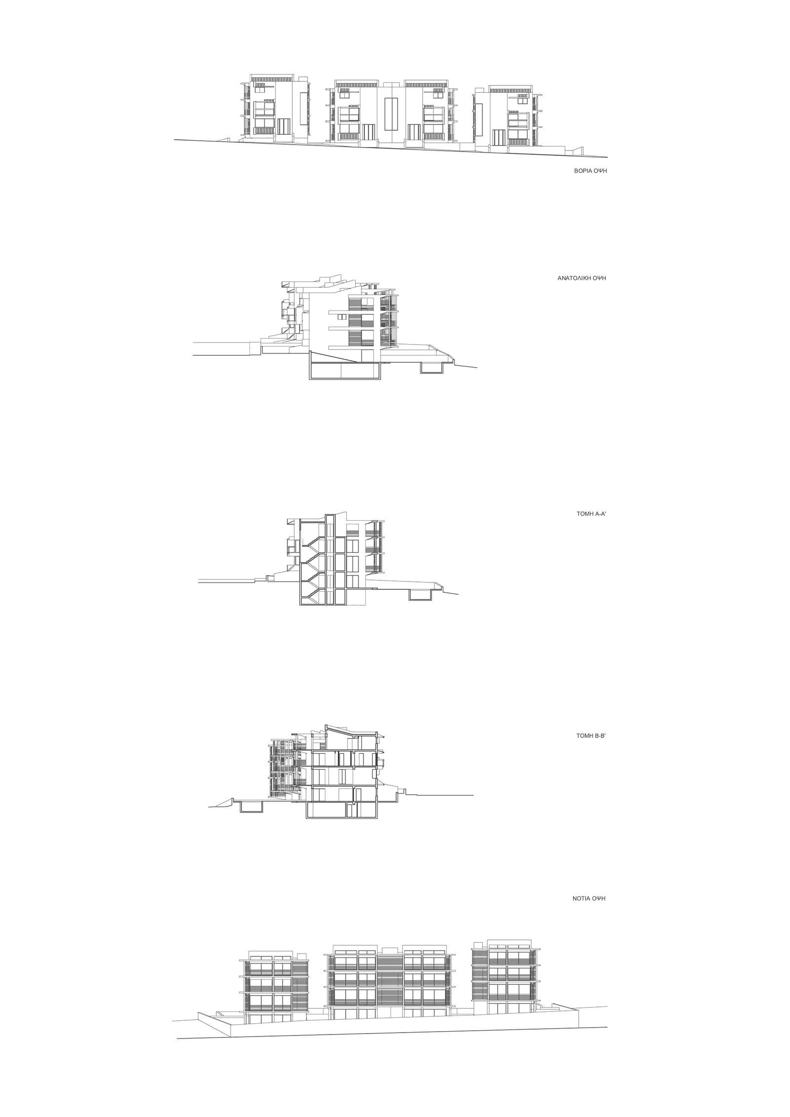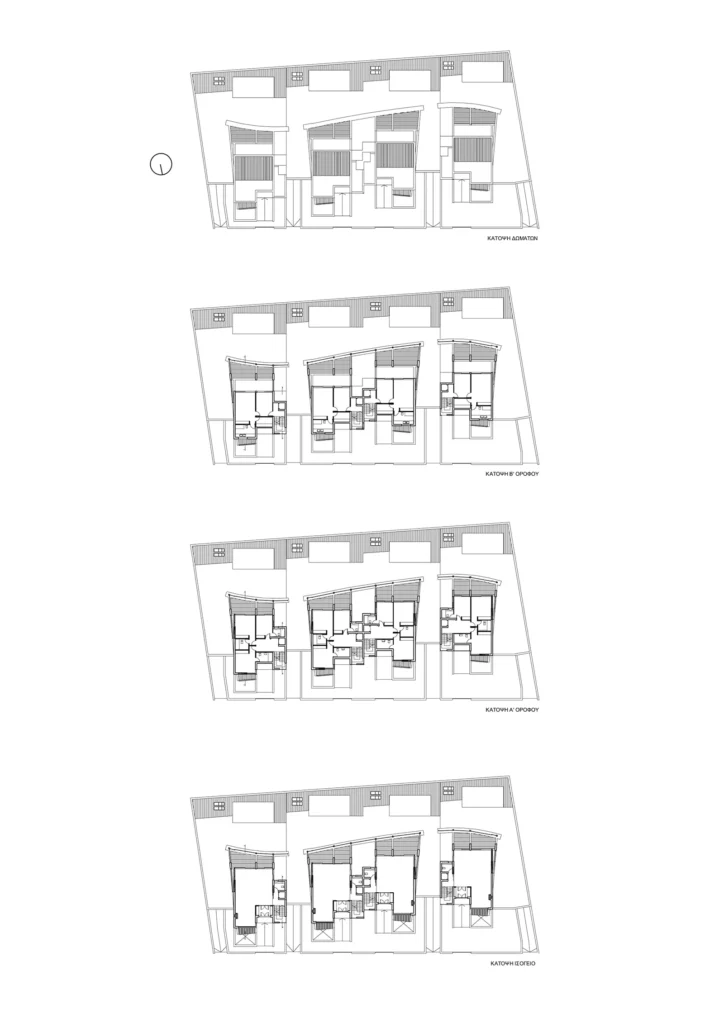 Σε οικόπεδο 1000 τ.μ. στην περιοχή της Κηφισιάς Αττικής, δημιουργούνται εν σειρά τέσσερεις κατοικίες των 250 τ.μ. έκαστη, σε κατακόρυφη ανάπτυξη τριών επιπέδων η κάθε μια. Στο νότο διατάσσεται η κοινή υπαίθρια πισίνα και οι όψεις των κτηρίων αντιμετωπίζονται ενιαία με κατασκευή βιοκλιματική. Αντιθέτως, η βόρια πλευρά των κτηρίων αντιμετωπίζεται με την ογκοπλαστική λογική της άρθρωσης σχέσεων με κενά και πλήρη.