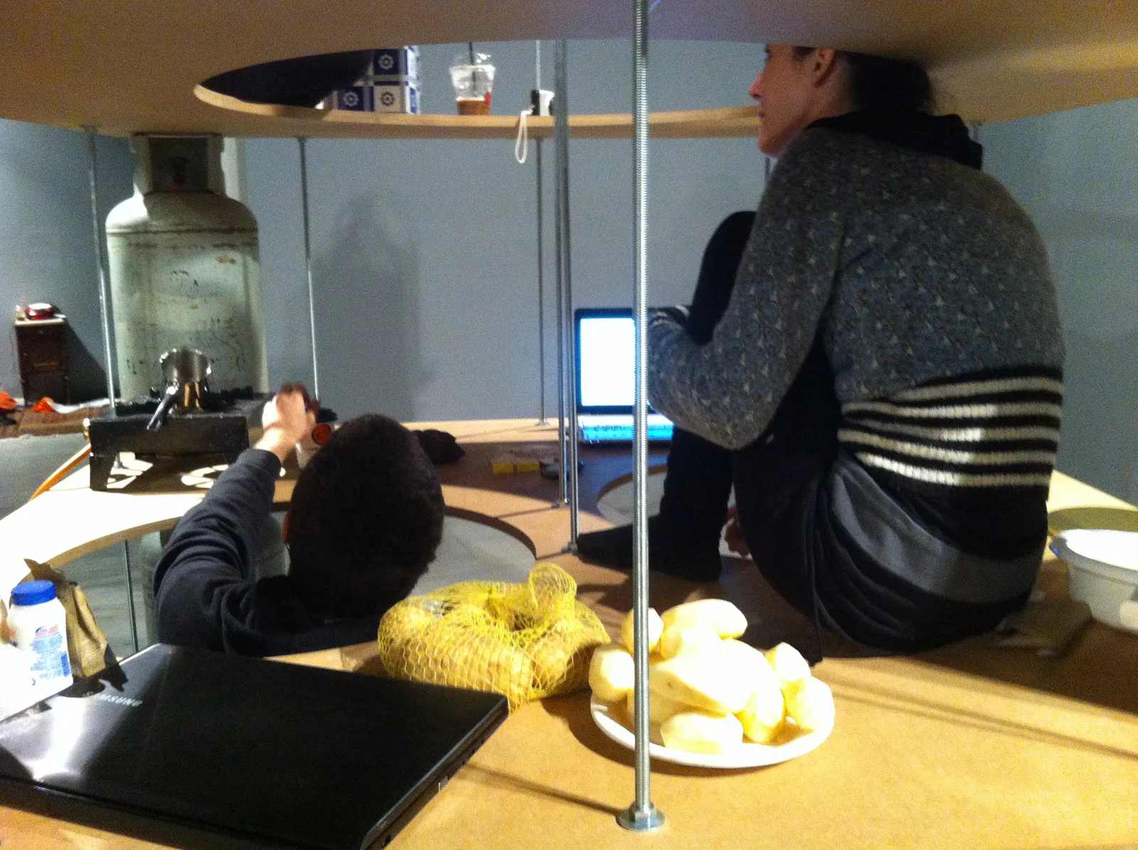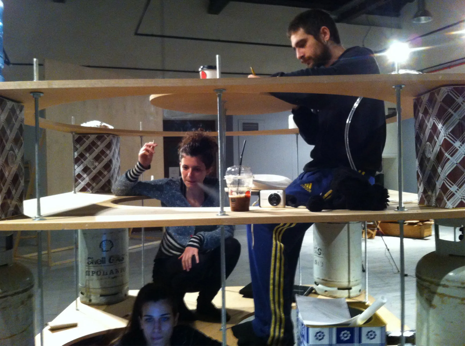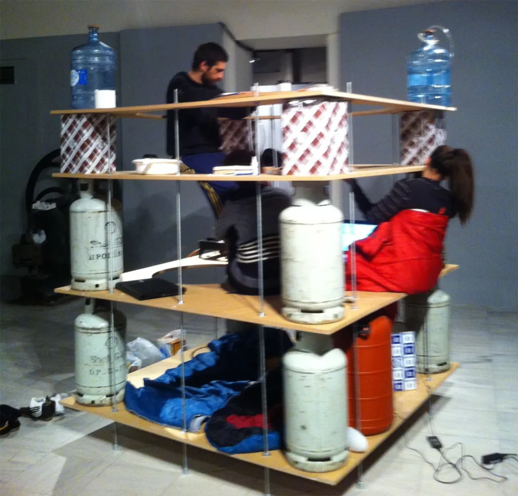Μέσα στον ενεργειακό και τον διατροφικό κύκλο της κατοίκησης, το ίδιο το ζωντανό σώμα είναι υποπροϊόν της διαδικασίας μεταβολισμού. Το «ΤΡΙΑΡΙ» είναι το στοιχειώδες ενδιαίτημα μιας μικρής ομάδας κατοίκων. Η κατασκευή του ανάγει τις υποδομές ενέργειας και μεταβολισμού σε στοιχεία που δομούν τον χώρο κατοίκησης. Οι φιάλες υγραερίου και οι ντενεκέδες του λαδιού γίνονται οι αντικαταστάσιμες κολόνες που στηρίζουν την κατασκευή. Τα φέροντα και τα κινητά στοιχεία αλλάζουν αλλά το ενδιαίτημα παραμένει σταθερό. Φιλοξενούνται δύο ή τρεις κάτοικοι και ακόμα ένας ξένος. Από άποψη τυπολογική, η μονάδα αποτελεί παραλλαγή του τυπικού τριαριού της πολυκατοικίας. Ο κρίσιμος όγκος της μονάδας είναι 6.6 κυβικά μέτρα. Ο αντίστοιχος όγκος ενός τυπικού τριαριού ξεπερνά τα 200 κυβικά μέτρα. Τα «Τριάρια» μπορεί να ενταχθούν στο εσωτερικό κενών διαμερισμάτων, σε βιομηχανικούς χώρους και στεγασμένες δημόσιες επικράτειες που έχουν χάσει τους παλιούς λειτουργικούς τους προορισμούς. Μια δυσμενής εκδήλωση της κρίσης στην Ελλάδα είναι η αδυναμία πολλών νοικοκυριών να αντεπεξέλθουν οικονομικά και να παραμείνουν συνδεδεμένα με τα δίκτυα των κοινών (νερό, ενέργεια, τροφή). Η Α.ΜΟ.Κ. προσφέρει τη δυνατότητα –και την υποδεικνύει συμβολικά- των κατοίκων να διαμείνουν στην κατασκευή, εντός άδειων αστικών- χώρων, χωρίς να είναι συνδεδεμένοι με τα ακριβά δίκτυα υποδομών της πόλης. Την πρώτη μέρα της έκθεσης πραγματοποιήθηκε περφόρμανς κατοίκησης του «Τριαριού».