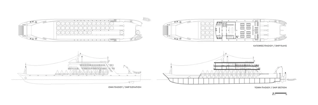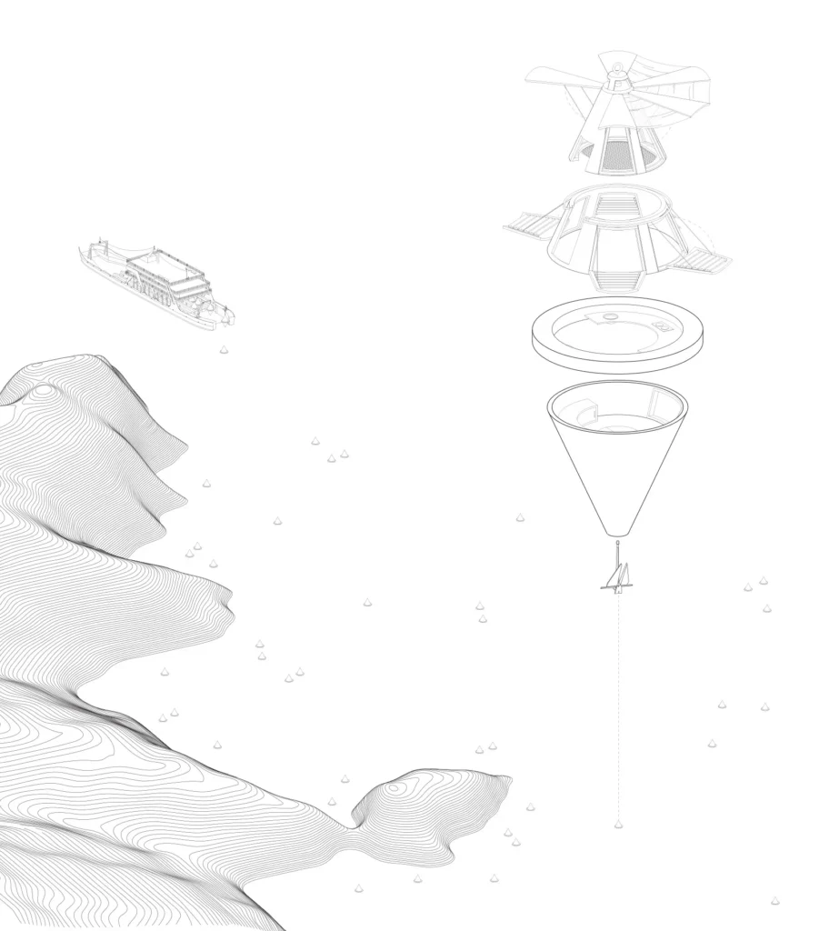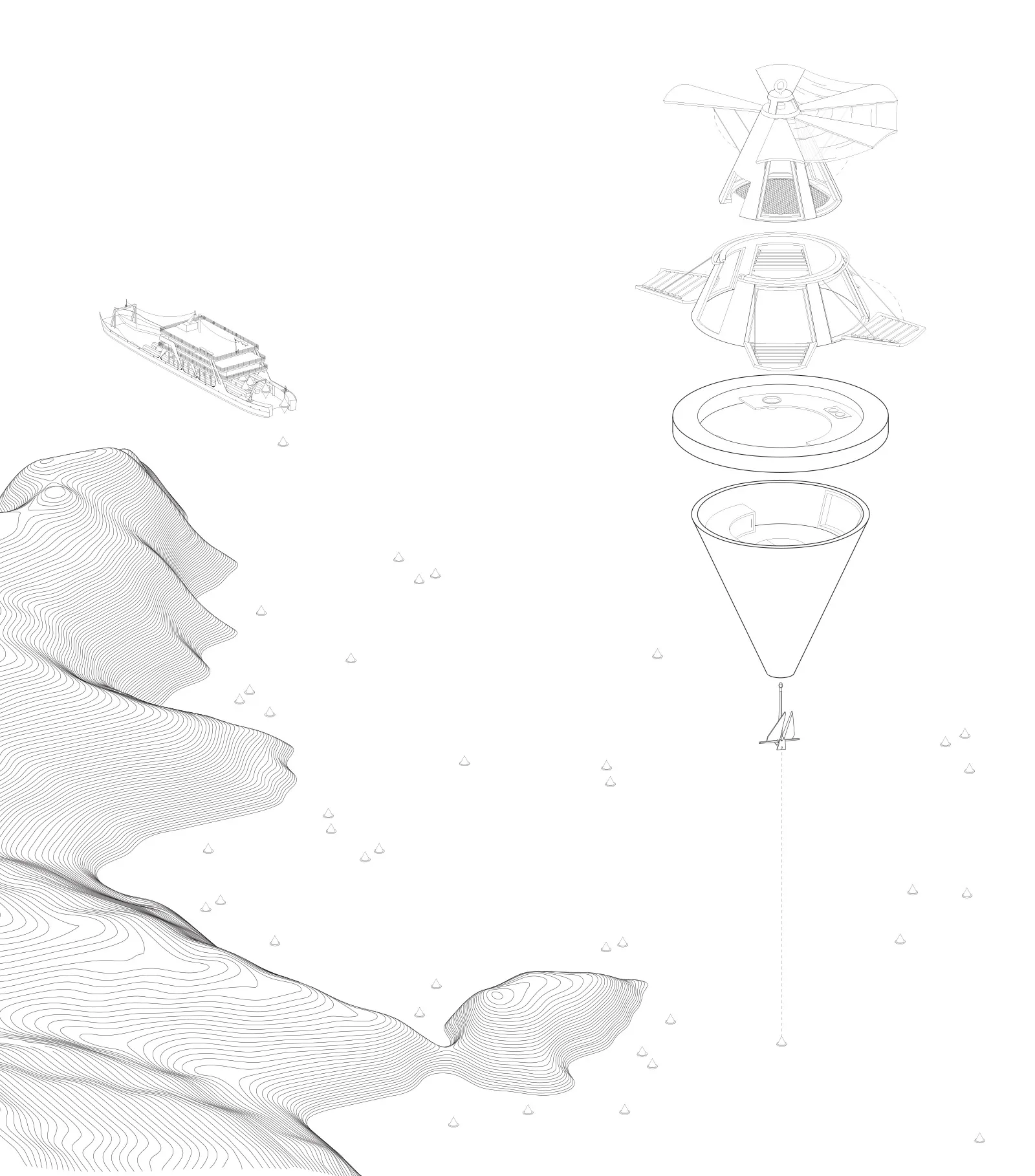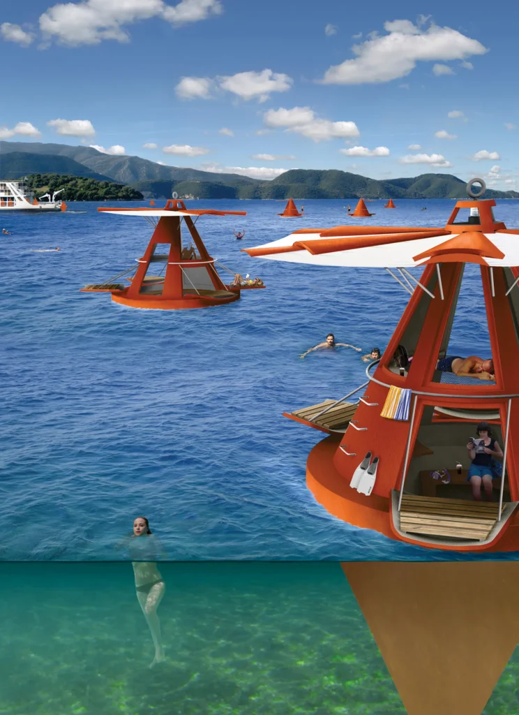 Ερευνάται η συνθήκη παραθαλάσσιας κατοίκησης με ελαχιστοποιημένο περιβαλλοντικό αποτύπωμα. Προτείνεται ο προγραμματισμός και ο σχεδιασμός μιας κινητής–πλωτής ξενοδοχειακής μονάδας, για την ελαχιστοποίηση του περιβαλλοντικού αποτυπώματος, όσο και για την παραγωγή μιας αμφίβιας εμπειρίας κατοίκησης. Έτσι, το έδαφος της αρχιτεκτονικής δεν είναι η στεριά αλλά η επιφάνεια της θάλασσας. Η πλωτή μονάδα αποτελείται από ένα τυπικό οχηματαγωγό πλοίο ανοικτού τύπου, το οποίο μετασκευάζεται για να μεταφέρει πενήντα μονάδες πλωτής κατοίκησης για τη διαμονή εκατό παραθεριστών. Η επιλογή αυτού του τύπου πλοίου επιχειρεί να ενεργοποιήσει έναν πλεονάζοντα και εν μέρει παροπλισμένο στόλο των ελληνικών ακτών. Το πλοίο επισκέπτεται απρόσβατες, προστατευμένες ακτογραμμές. Οι πλωτές μονάδες ποντίζονται, διαμοιράζονται, κατοικούνται και επανασυλλέγονται. Το μητρικό πλοίο λειτουργεί ως κινητός χώρος υποδοχής ξενοδοχειακών λειτουργιών κοινής χρήσης, με δυνατότητα «απόβασης» σε προσβάσιμες από τη θάλασσα περιοχές. Οι πλωτές μονάδες είναι τα «δωμάτια»—με απλή εργονομική οργάνωση και ενεργειακή αυτονομία—μιας ημιυπαίθριας και αμφίβιας κατοίκησης. Για υδροστατικούς αλλά και συμβολικούς λόγους χρησιμοποιείται το σχήμα μιας τυπικής σημαδούρας αγκυροβόλιου ελαφρών σκαφών (ρεμέτζο), από αυτές που γεμίζουν τις ελληνικές ακτές τους θερινούς μήνες.