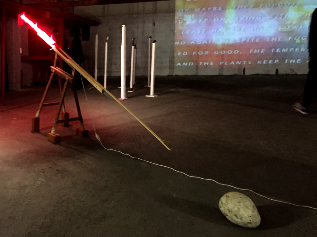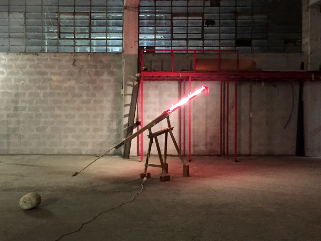“Asteroid Delayed” is an installation of assembled material, with a length of 3m. It demonstrates a coincidence of one stone targeting another bigger stone. It belongs to a wider project by Zissis Kotionis called “Lithology”, a pseudoscientific, poetic approach to the geological conditions of the anthropocene.
