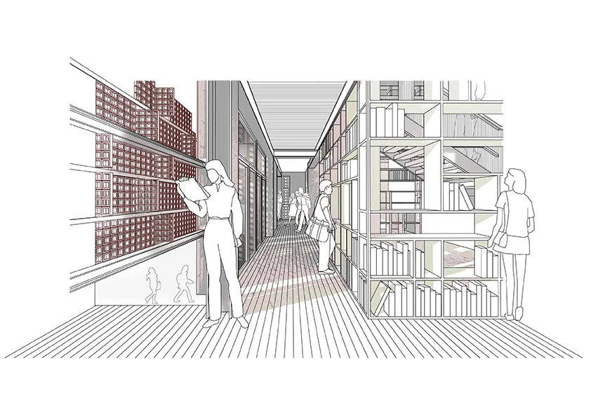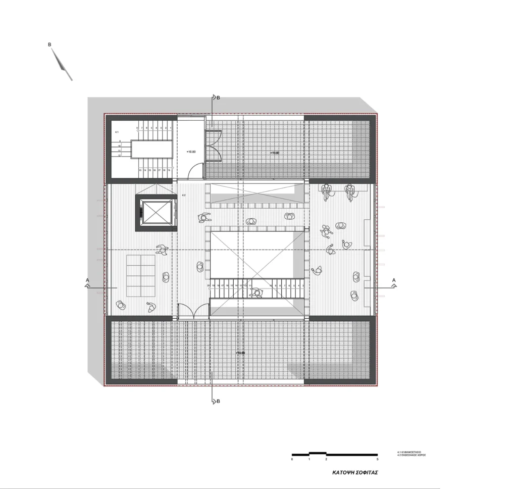 Ολόκληρη η διαμόρφωση του κεντρικού χώρου γίνεται με το συνδυασμό μεταλλικών φερόντων στοιχείων (δοκάρια, κολόνες) και ξύλινων στοιχείων (δάπεδα, στηθαία, σκάλες, βιβλιοστάσια, έπιπλα). Η ιδέα μιας κιβωτού επανέρχεται στα υλικά καθώς η αίσθηση για τον/την χρήστη του χώρου θα θέλαμε να είναι η αίσθηση ότι βρίσκεσαι εντός ενός μεγάλου επίπλου, εντός ενός ξύλινου κουτιού.