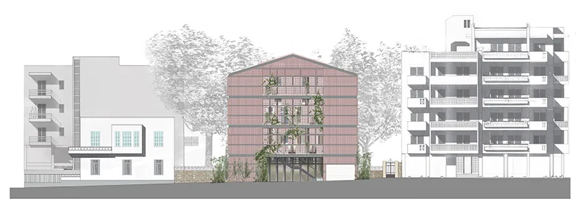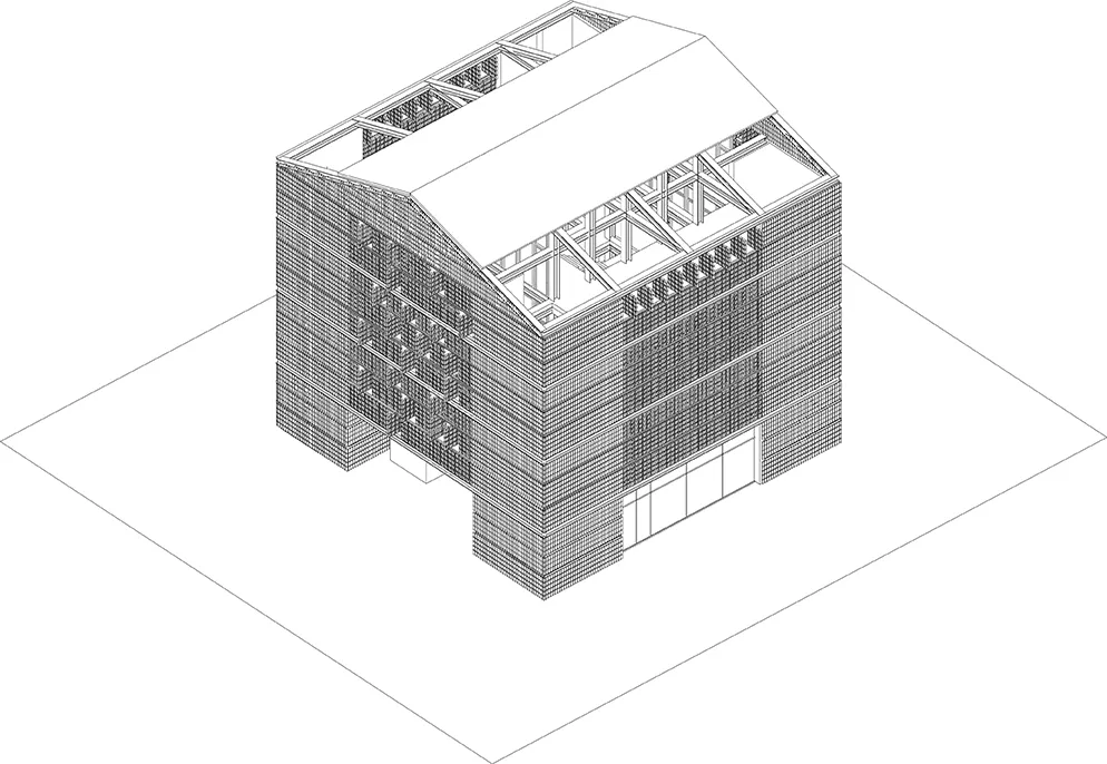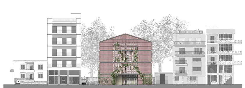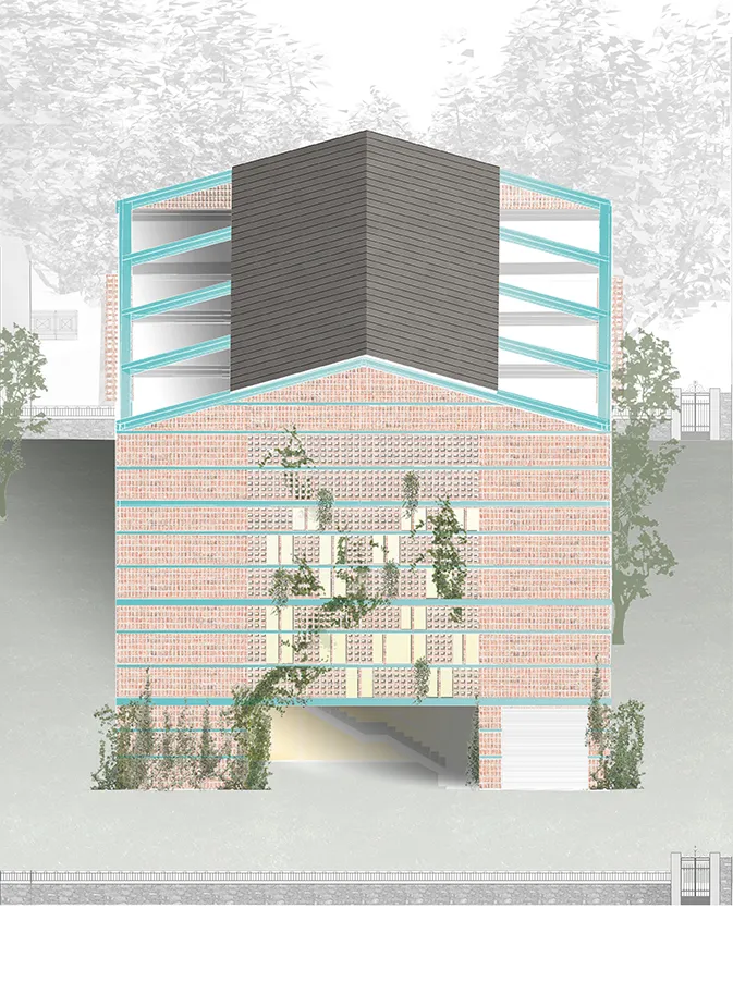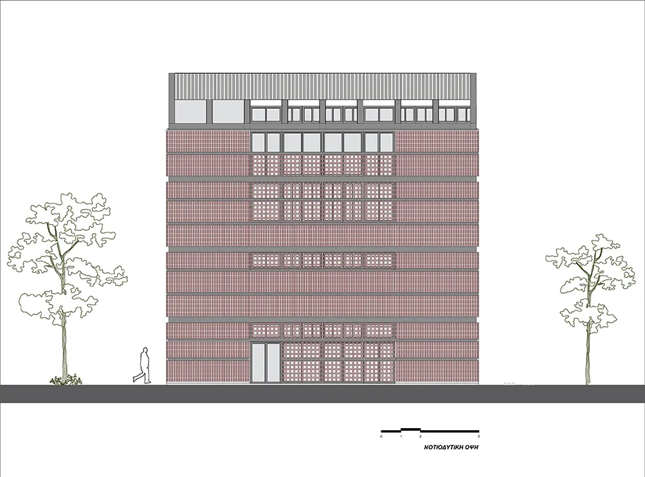Το εξωτερικό της δομής του κτηρίου είναι συνολικά ένα κεραμικό κέλυφος που τυλίγει την δομή και το εσωτερικό του εξασφαλίζοντας διαμπερότητα και δροσισμό με την πορώδη δομή του (κλωστρά, φεγγίτες και ανοίγματα). Οι όψεις του κτηρίου επικαλύπτονται συνολικά με κεραμικά στοιχεία, δηλαδή συμπαγή τούβλα και κεραμικά κλωστρά. Ο σχεδιασμός του κτιριακού περιβλήματος υπακούει εν γένει στις αρχές του βιοκλιματικού σχεδιασμού, σε σχέση με τον διαμπερή αερισμό αλλά και την ηλιοπροστασία των εσωτερικών χώρων. Το τούβλινο κτήριο είναι μια πρόταση εξ ίσου πολύ παλιά αλλά και πολύ επίκαιρη στις συνθήκες περιβαλλοντικής κρίσης που βιώνουμε όλοι, καθώς ως υλικό έχει μικρό περιβαλλοντικό αποτύπωμα και δημιουργεί καλές συνθήκες μικροκλίματος τόσο για το κτήριο όσο και για το πάρκο-πλατεία.