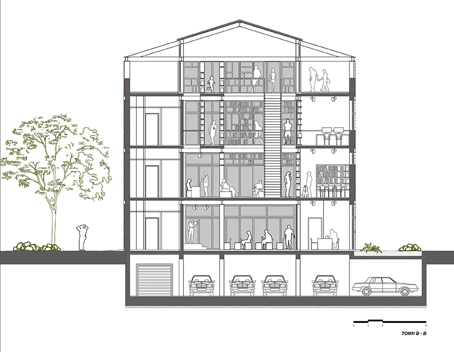 Πρόκειται για έναν κύβο με διαστάσεις δεκαέξι επί δεκαέξι μέτρα σε κάτοψη και περίπου ανάλογο ύψος. Η εσωτερική δομή του βασίζεται σε έναν τριμερισμό της κάτοψης σε ένα κεντρικό και δύο πλάγια κλίτη, στην αρχαία τυπολογία της βασιλικής όπως είναι για παράδειγμα ο εμβληματικός για τον Βόλο ναός του Αγίου Κωνσταντίνου, με αρχιτέκτονα τον Α. Ζάχο. Τα δύο πλάγια “κλίτη” φιλοξενούν κυρίως βοηθητικές χρήσεις (χώροι υγιεινής, οριζόντια και κατακόρυφη κίνηση, βιβλιοστάσια) ενώ το κεντρικό κλίτος είναι ένας ενιαίος και διαμπερής χώρος τόσο σε οριζόντιο όσο και στον κατακόρυφο άξονα. Εκεί γίνεται η πύκνωση των κοινών δραστηριοτήτων εντός του κτηρίου από την ανάγνωση ως την διεπαφή, τις συγκεντρώσεις του κοινού (ισόγειο) αλλά και την εκτόνωση της κοινόχρηστης δραστηριότητας ως το πατάρι και τα δώματα του κτηρίου.