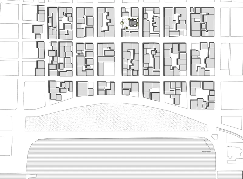 Ο ρόλος της βιβλιοθήκης, τόσο λειτουργικά όσο και συμβολικά είναι κυρίαρχος στην διάρθρωση και την γενική εικόνα του κτηρίου. Η μορφολογία του προσιδιάζει προς την ατμόσφαιρα ενός μονολιθικού αλλά ταυτόχρονα και διαμπερούς κτηρίου μέσα στην υπό διαμόρφωση πλατεία-πάρκο. Σκοπός είναι να δομηθεί ένα είδος ευτοπίας, με ανοικτή πρόσβαση, μέσα στον αστικό ιστό της πόλης. Για το λόγο αυτό, ιδιαίτερη σημασία πρέπει να δοθεί και στον σχεδιασμό του υπαίθριου χώρου της πλατείας και να αξιοποιηθούν τα υπάρχοντα φυσικά στοιχεία, (τα μεγάλα –ιστορικά για την περιοχή– δέντρα) και να διαμορφωθεί τελικά ο ενιαίος υπαίθριος χώρος σαν μικρό αστικό πάρκο.