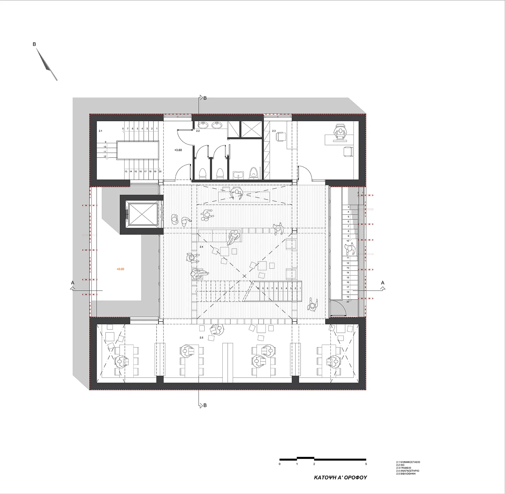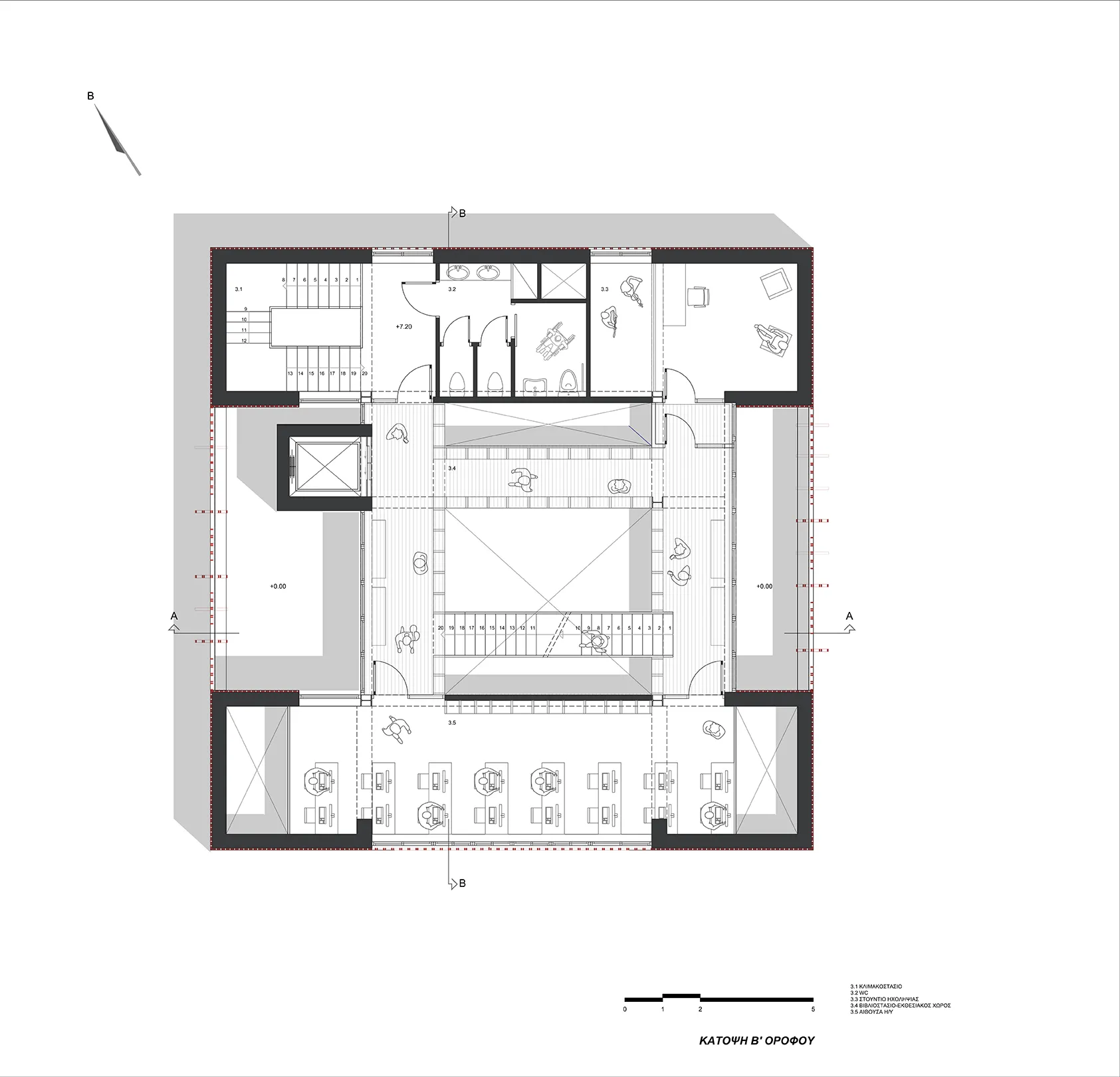 Ολόκληρη η διαμόρφωση του κεντρικού χώρου γίνεται με το συνδυασμό μεταλλικών φερόντων στοιχείων (δοκάρια, κολόνες) και ξύλινων στοιχείων (δάπεδα, στηθαία, σκάλες, βιβλιοστάσια, έπιπλα). Η ιδέα μιας κιβωτού επανέρχεται στα υλικά καθώς η αίσθηση για τον/την χρήστη του χώρου θα θέλαμε να είναι η αίσθηση ότι βρίσκεσαι εντός ενός μεγάλου επίπλου, εντός ενός ξύλινου κουτιού.