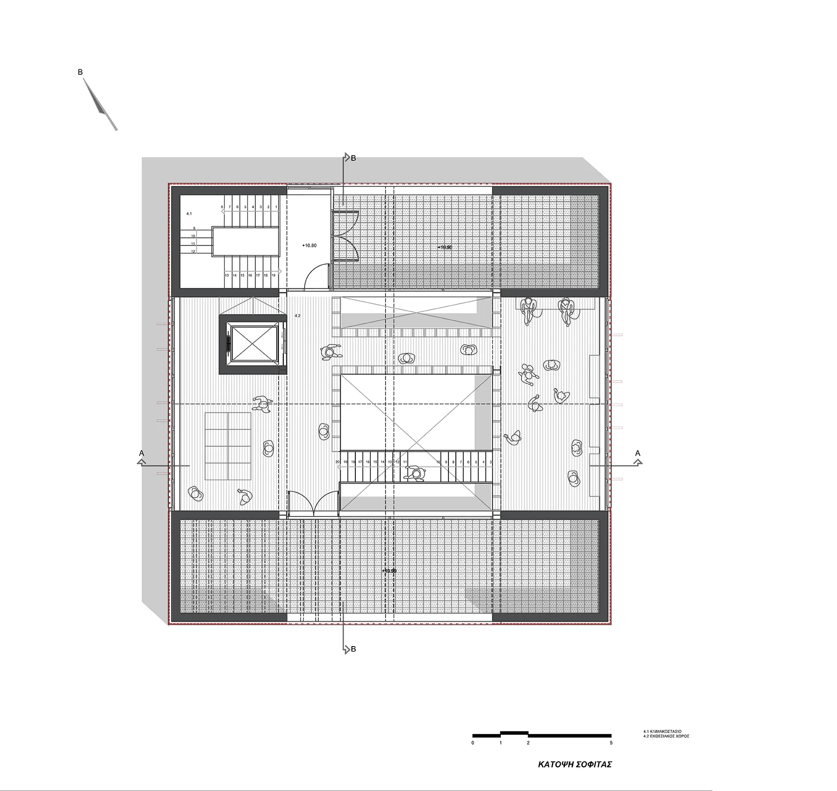 Η δίρριχτη στέγη, με αναφορά στις επικλινείς στέγες της πηλιορείτικες ναοδομίας υπηρετεί και την τοποθέτηση φωτοβολταϊκών πανέλων, στην μεσημβρινή πλευρά της στέγης και τονίζει τον δημόσιο, εμβληματικό χαρακτήρα του κτηρίου ως τοπόσημο και σύμβολο της κοινότητας των υποκειμένων που φιλοξενεί. Στα δώματα, εκατέρωθεν της στέγης, στο μεν βορινό θα τοποθετηθούν οι κεντρικές μονάδες κλιματισμού και οι ηλιακοί συλλέκτες ενώ στο νότιο δώμα, σε προέκταση του εκθεσιακού χώρου της “σοφίτας” δημιουργείται περιορισμένος υπαίθριος εκθεσιακός χώρος.
