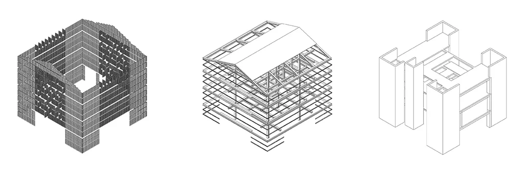 Από κατασκευαστική άποψη, τα δύο πλάγια κλίτη θα είναι κατασκευασμένα από οπλισμένο σκυρόδεμα ενώ το κεντρικό κλίτος θα είναι μεταλλική κατασκευή που θα γεφυρώνει τα ανοίγματα μεταξύ των δύο πλάγιων πτερύγων. Πρόκειται για μια τυπολογία τριμερισμού με σύμμεικτη κατασκευή βασισμένη στις βασικές γεωμετρίες του προκύπτουν από τον τριμερισμό του τετραγώνου.